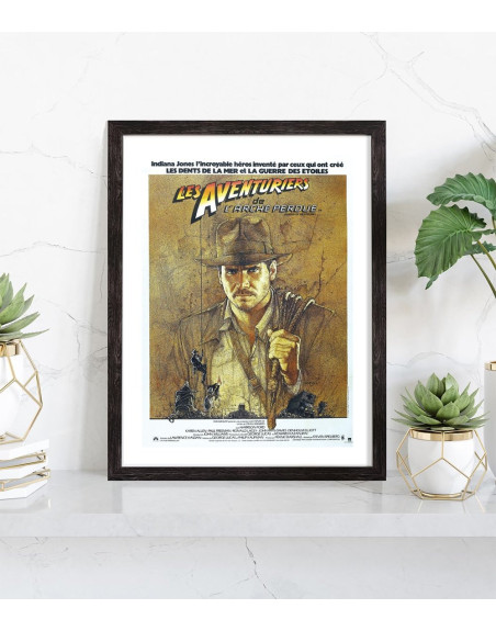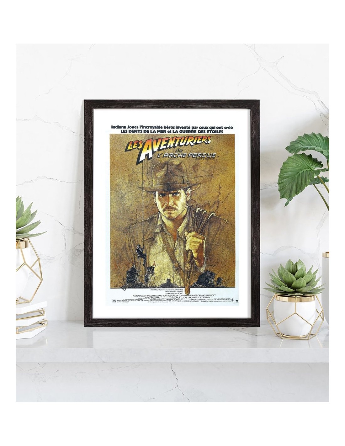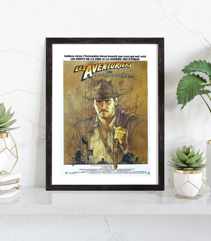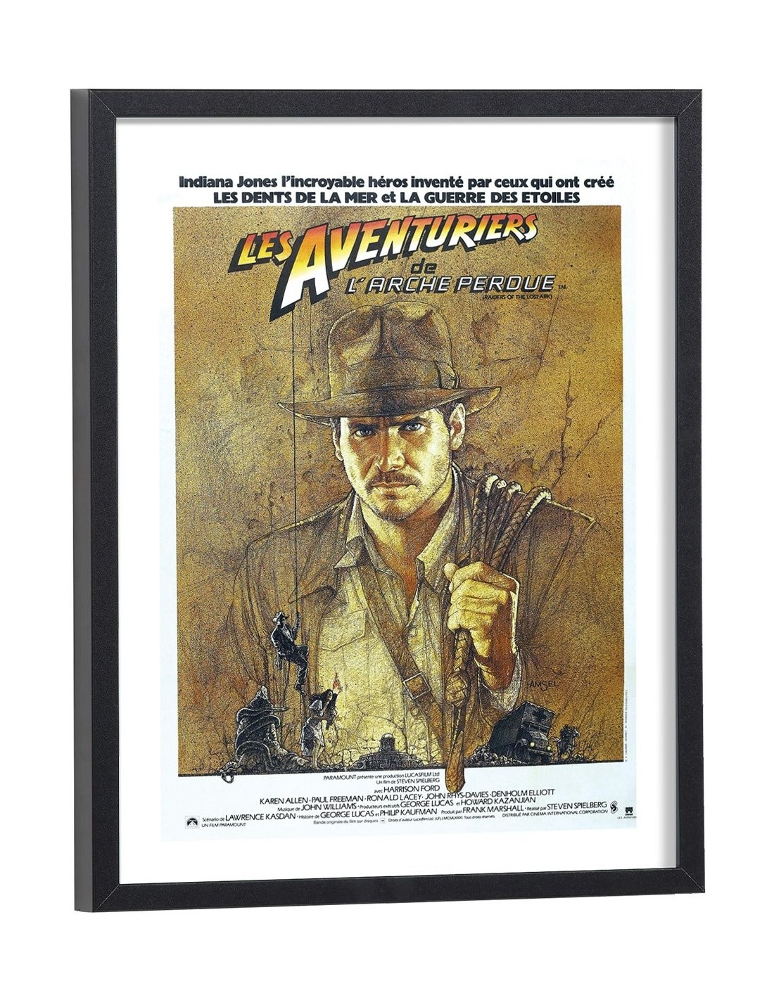 Affiche du film Indiana Jones "Les Aventuriers de l'arche perdue". Affiche encadrée avec cadre en bois noir.