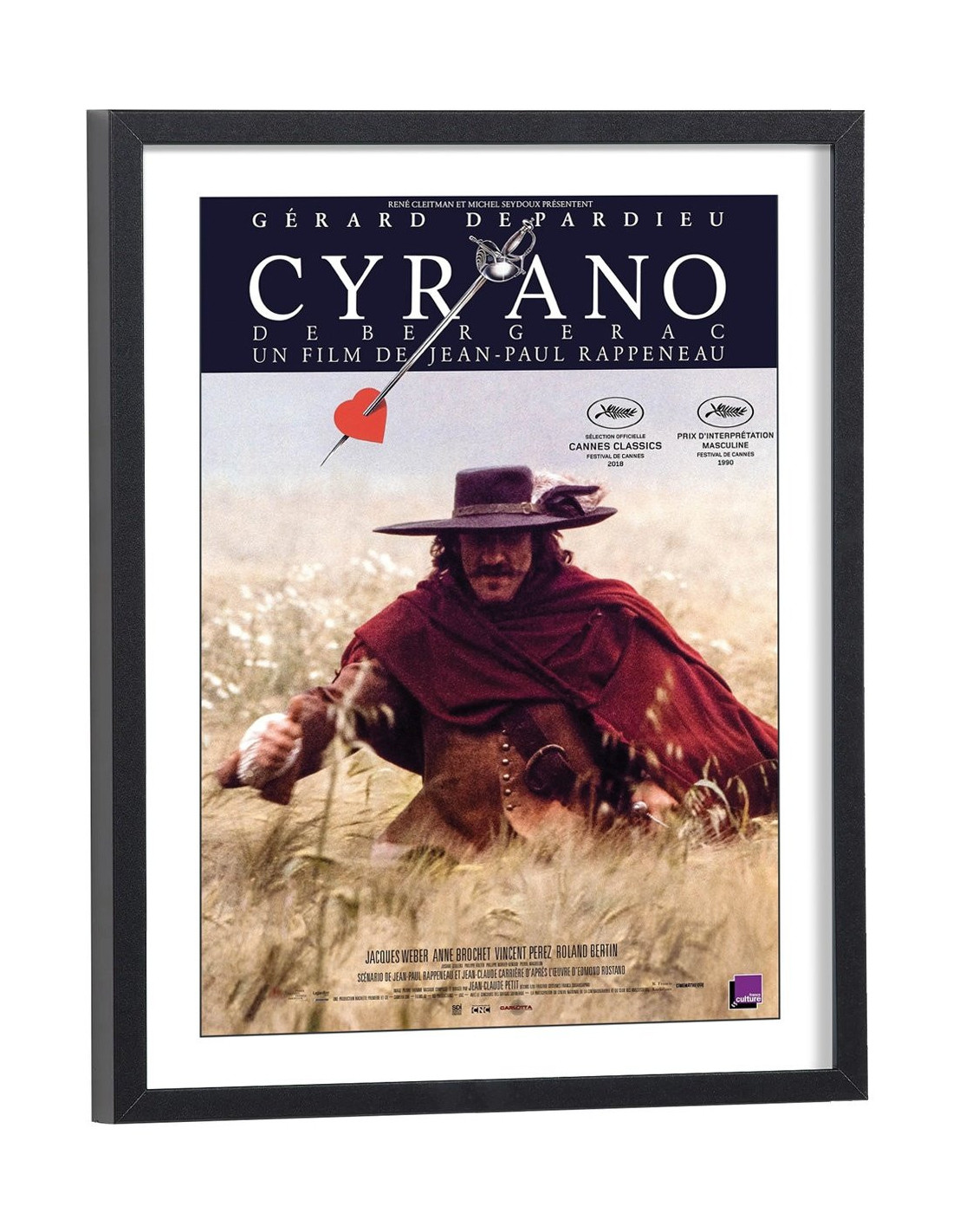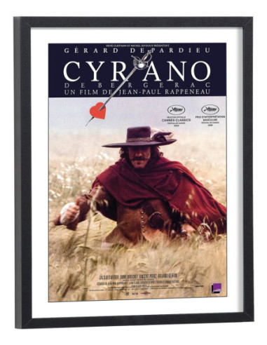 Affiche du film "Cyrano de Bergerac" avec Gérard Depardieu sorti au cinéma en 1990. Affiche encadrée avec cadre en bois noir.