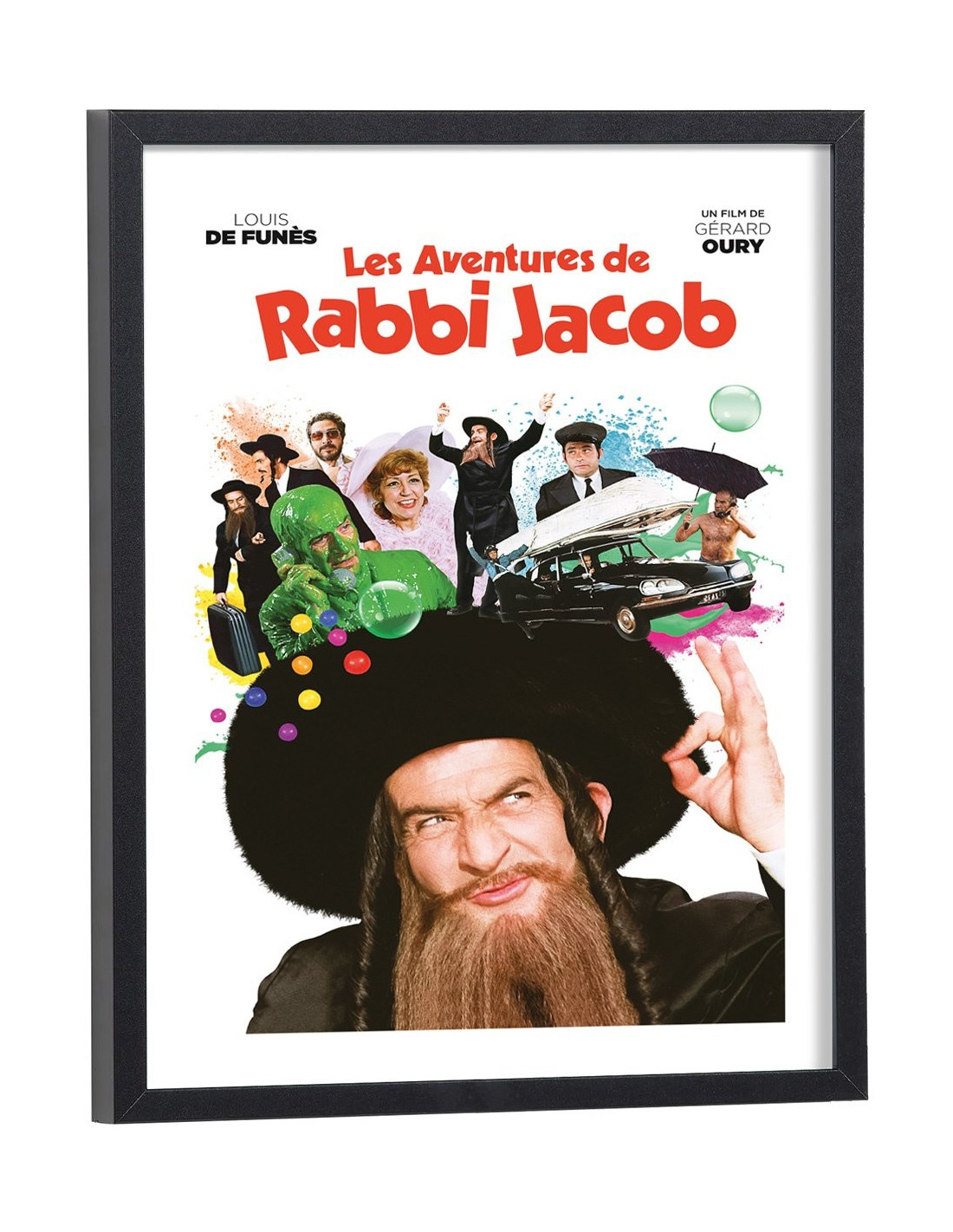 Affiche du film "Les Aventures de Rabbi Jacob" avec Louis De Funès sorti au cinéma en 1973. Affiche encadrée avec cadre en bois noir.