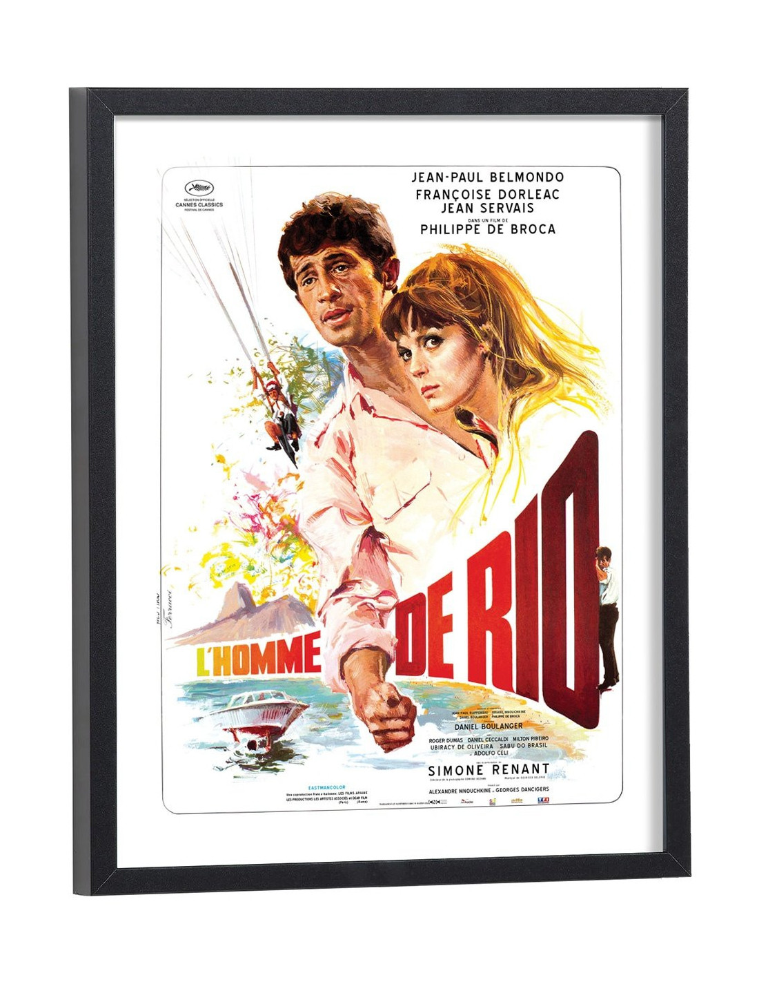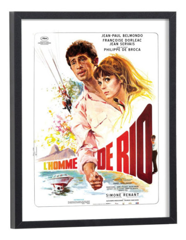 Affiche du film "L'homme de Rio" avec Jean-Paul Belmondo sorti au cinéma en 1964. Affiche encadrée avec cadre en bois noir.