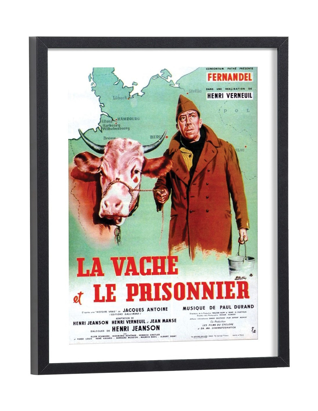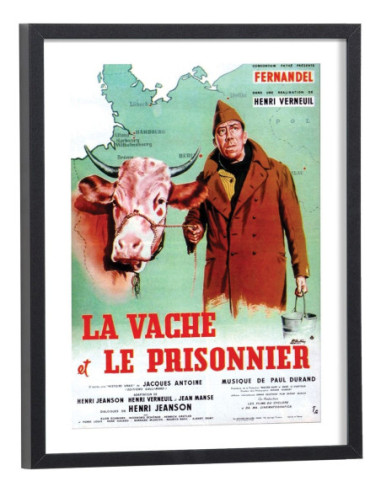 Affiche du film "La vache et le prisonnier" avec Fernandel sorti au cinéma en 1959. Affiche encadrée avec cadre en bois noir.