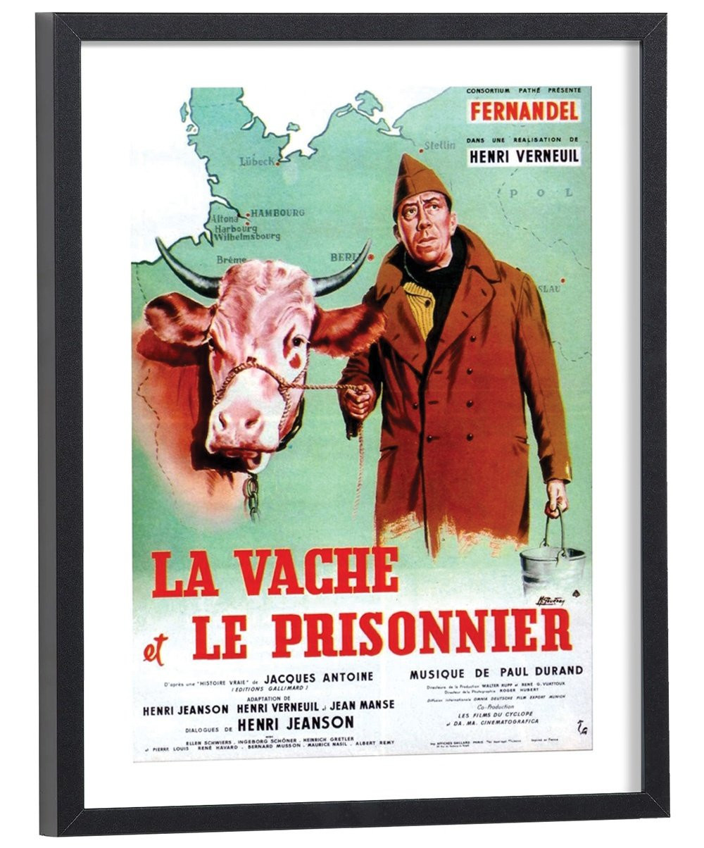 Affiche du film "La vache et le prisonnier" avec Fernandel sorti au cinéma en 1959. Affiche encadrée avec cadre en bois noir.
