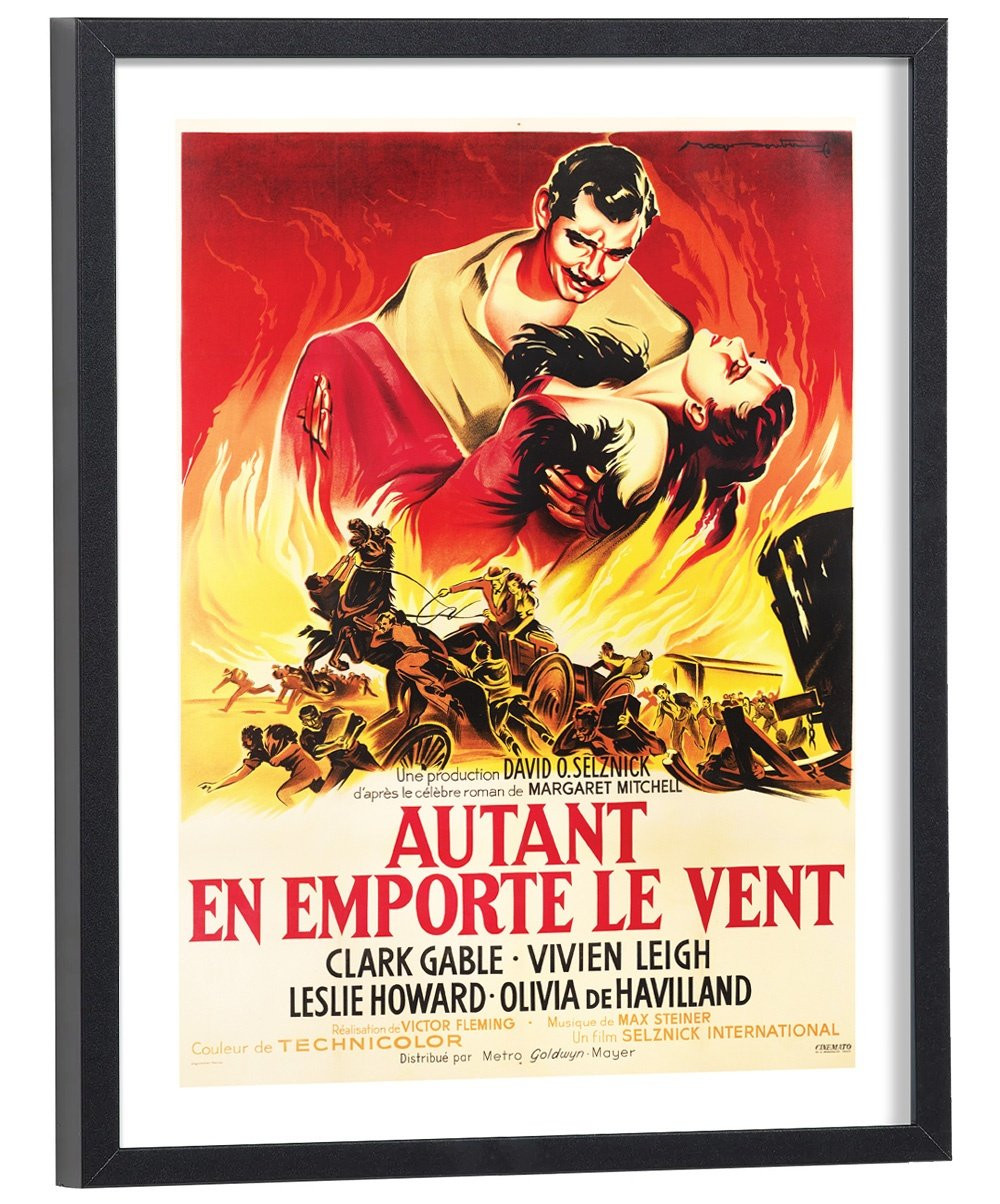 Affiche du film "Autant en emporte le vent" sorti au cinéma en 1939. Affiche encadrée avec cadre en bois noir.