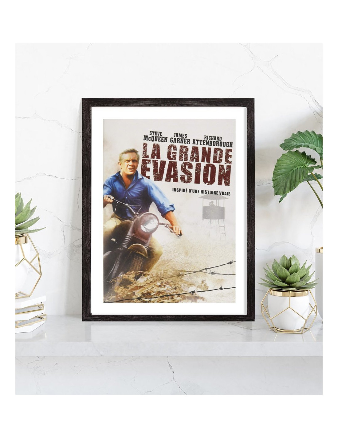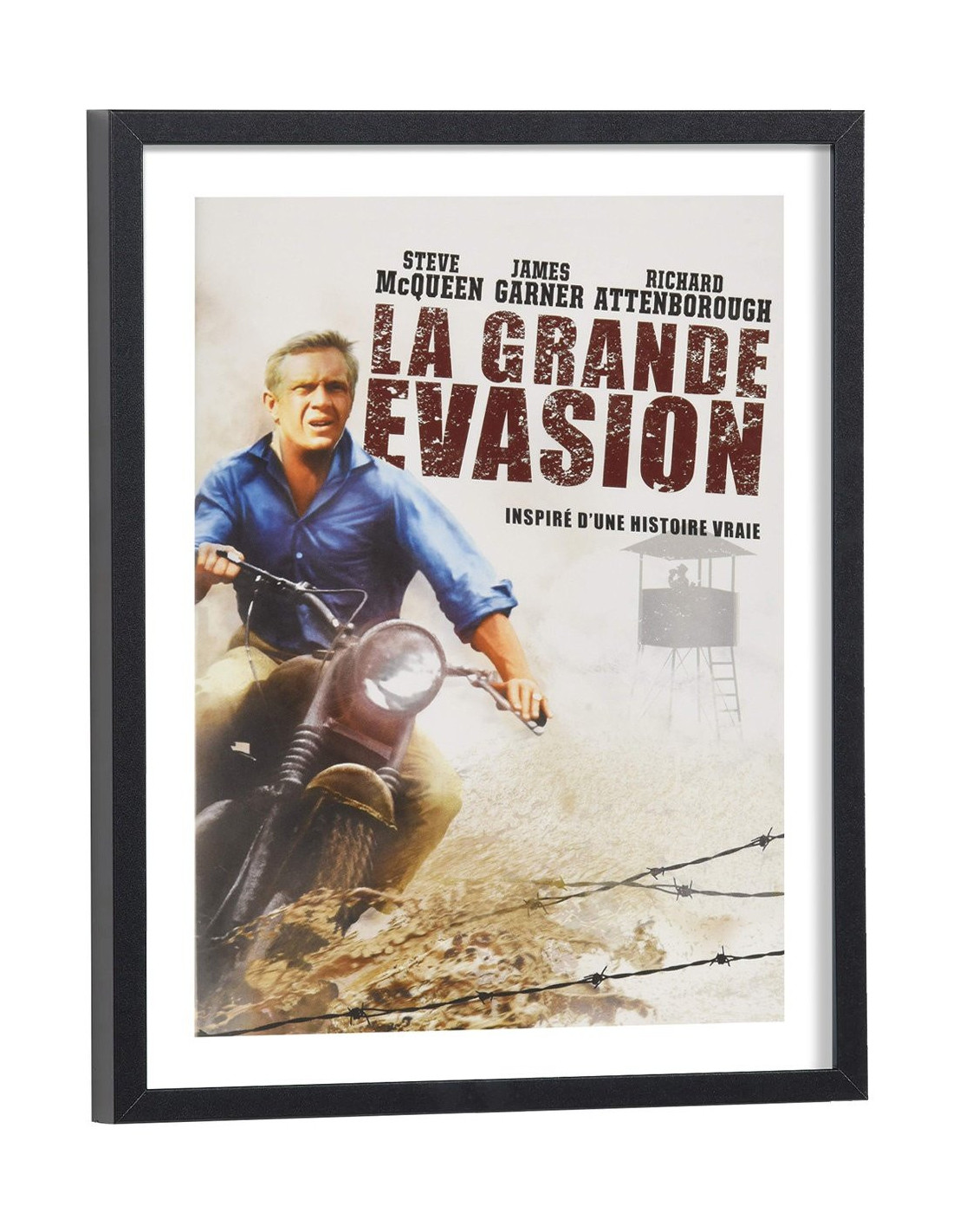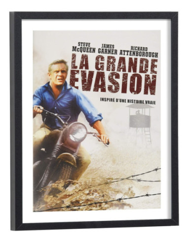 Affiche du film "La grande évasion" sorti au cinéma en 1963. Sur cette affiche, on peut voir Steve McQueen en moto. Affiche encadrée avec cadre en bois noir.