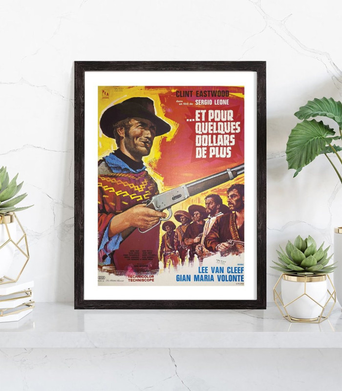 Affiche du film "Et pour quelques dollars de plus" western sorti au cinéma en 1965 avec Clint Eastwood. Affiche encadrée avec cadre en bois noir.