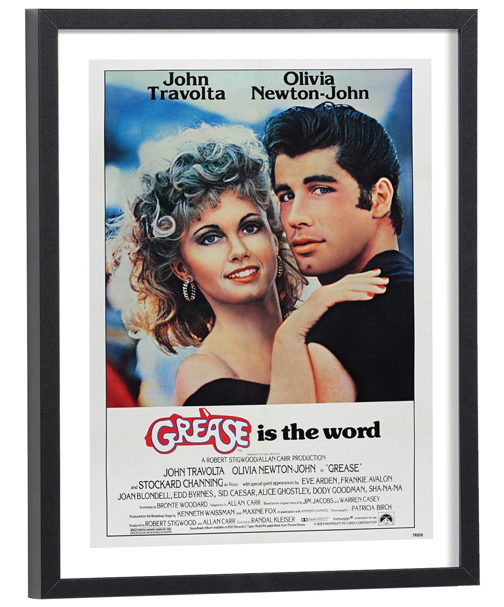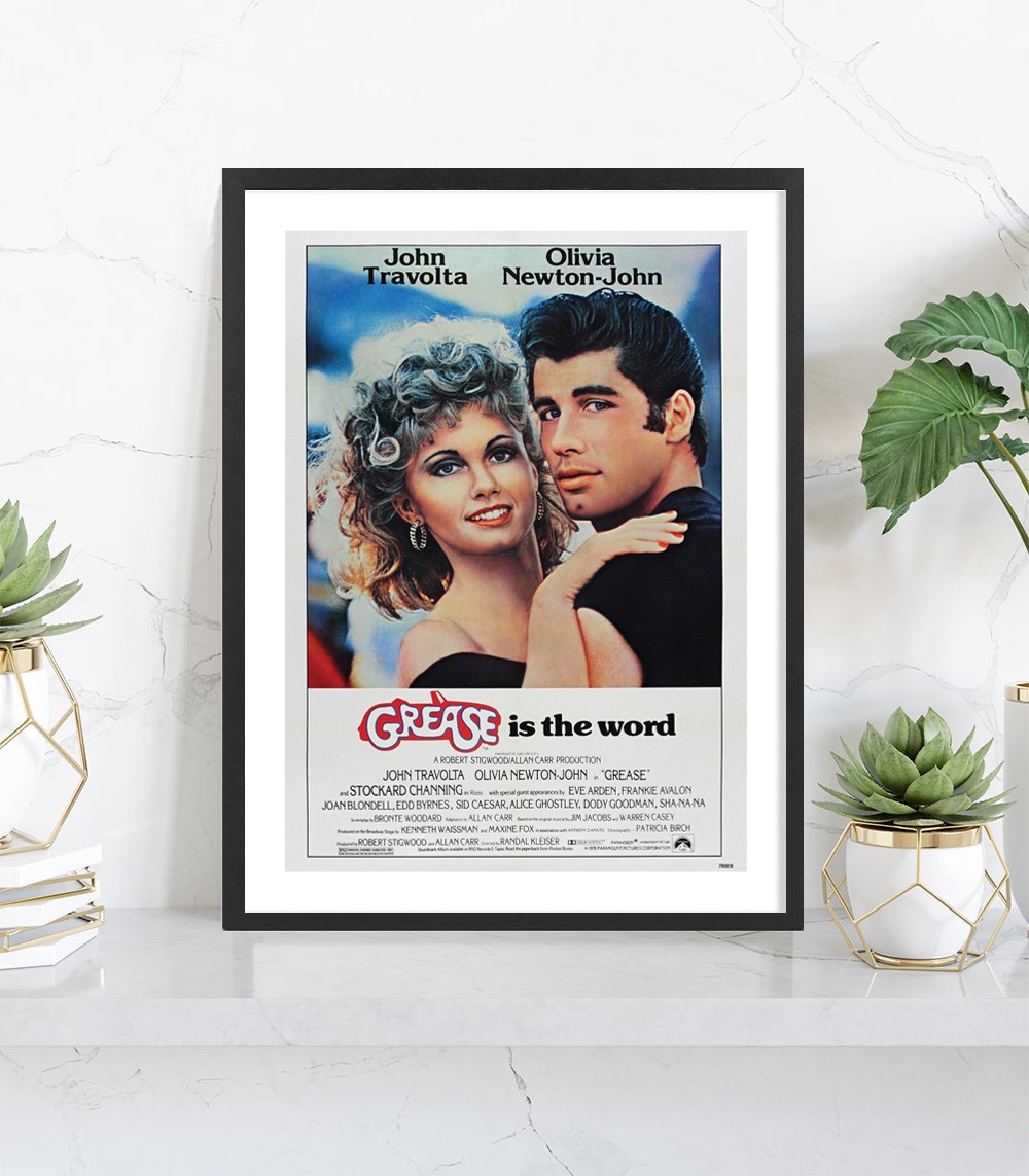 Affiche cinéma encadrée du film Grease mettant en scène John Travolta et Olivia Newton-John. Un poster incontournable des années 70.