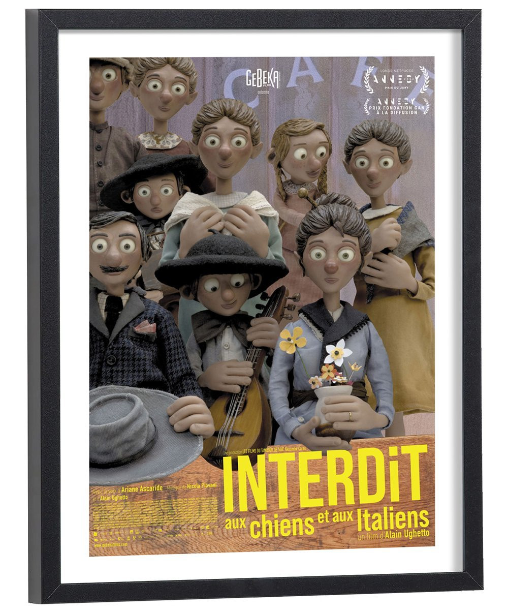 Affiche du film "Interdit aux chiens et aux italiens" sorti au cinéma en 2022. Affiche encadrée avec cadre en bois noir.