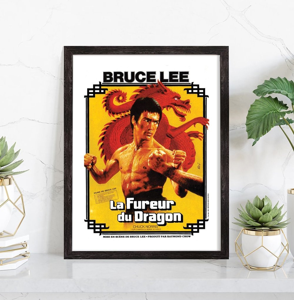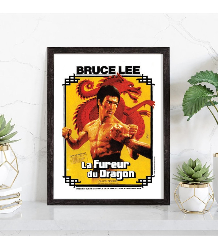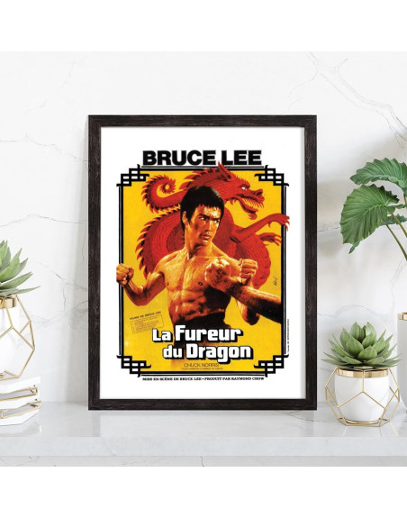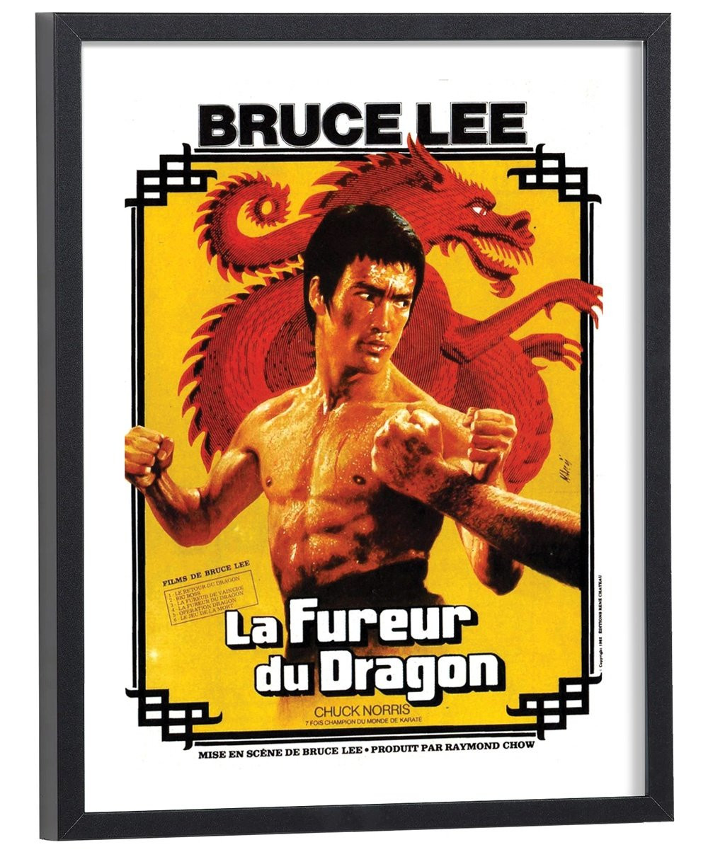 Affiche du film "La fureur du dragon" avec Bruce Lee. Affiche encadrée avec cadre en bois noir.