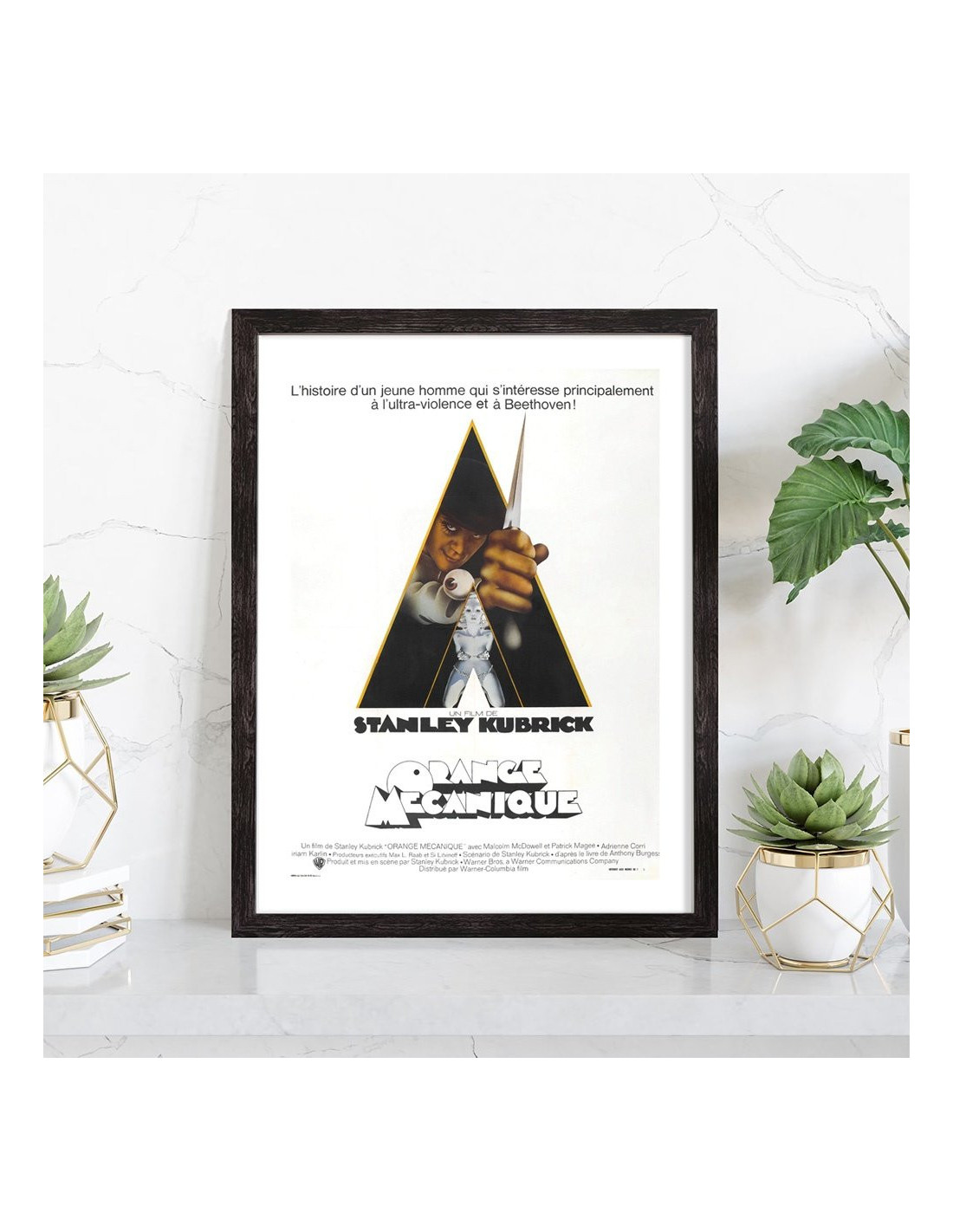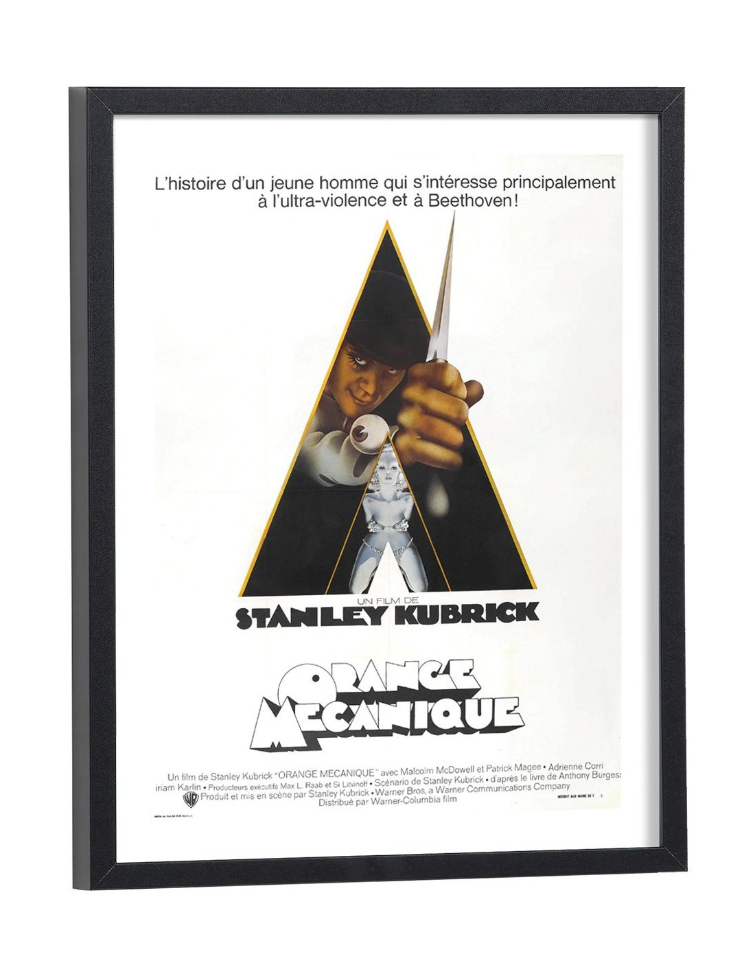 Affiche du film "Orange mécanique" sorti au cinéma en 1971, réalisé par Stanley Kubrick. Affiche encadrée avec cadre en bois noir.