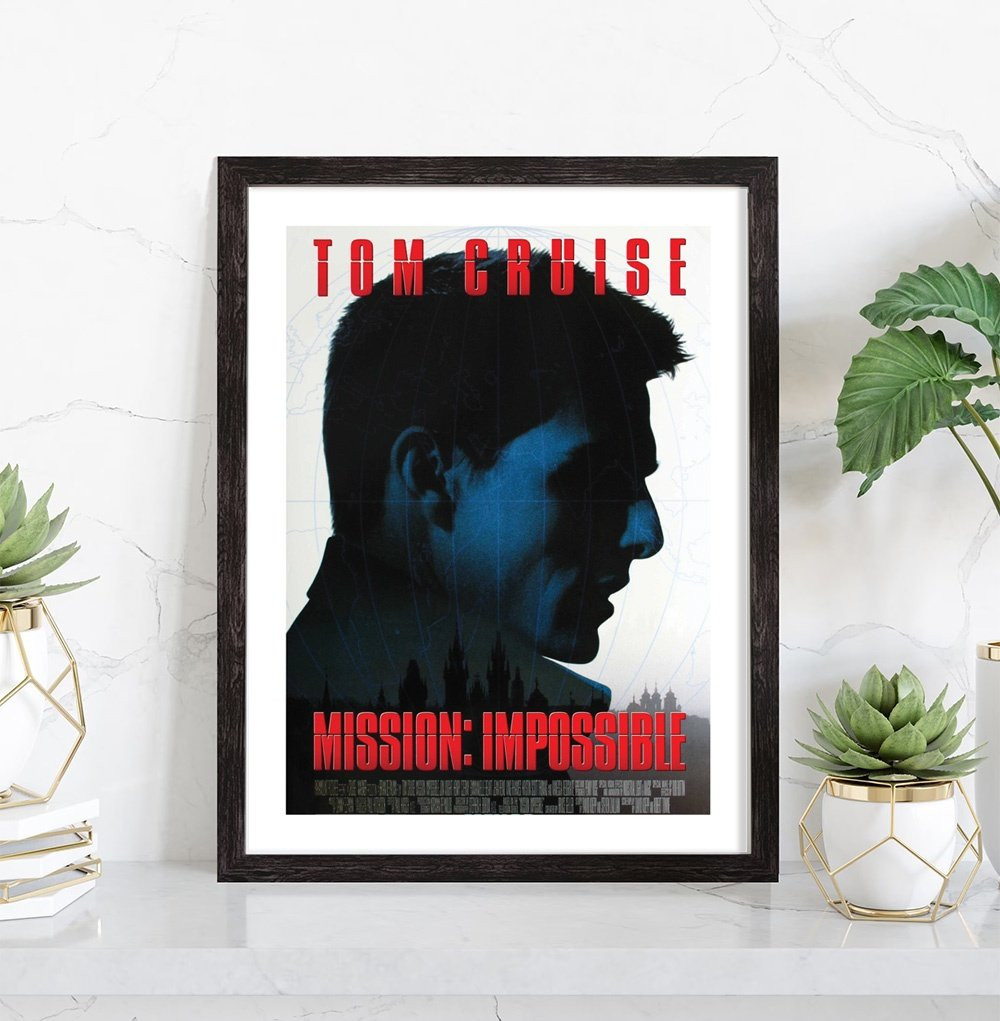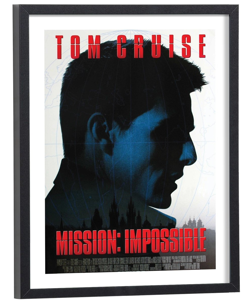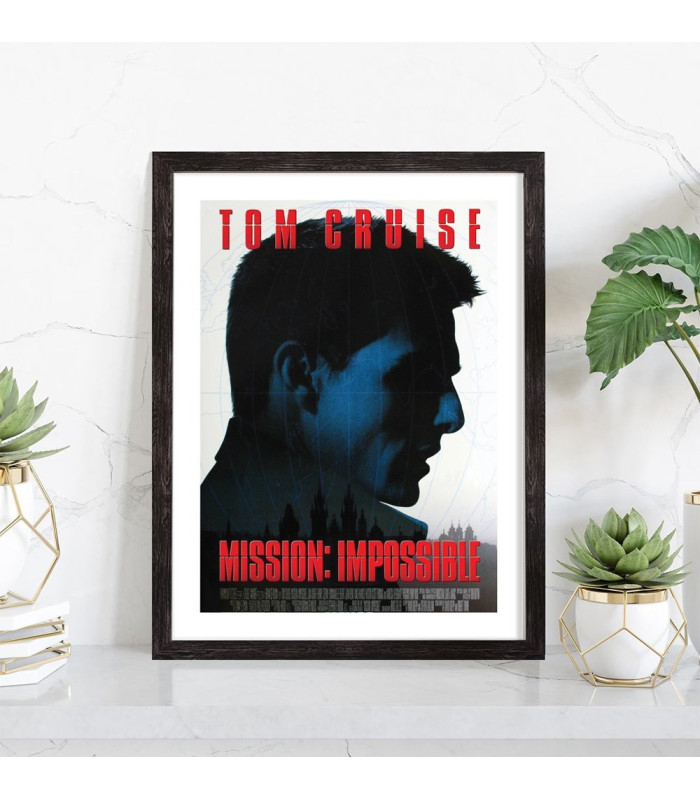 Affiche du film "Mission Impossible" avec Tom Cruise sorti au cinéma en 196, réalisé par Brian De Palma. Affiche encadrée avec cadre en bois noir.