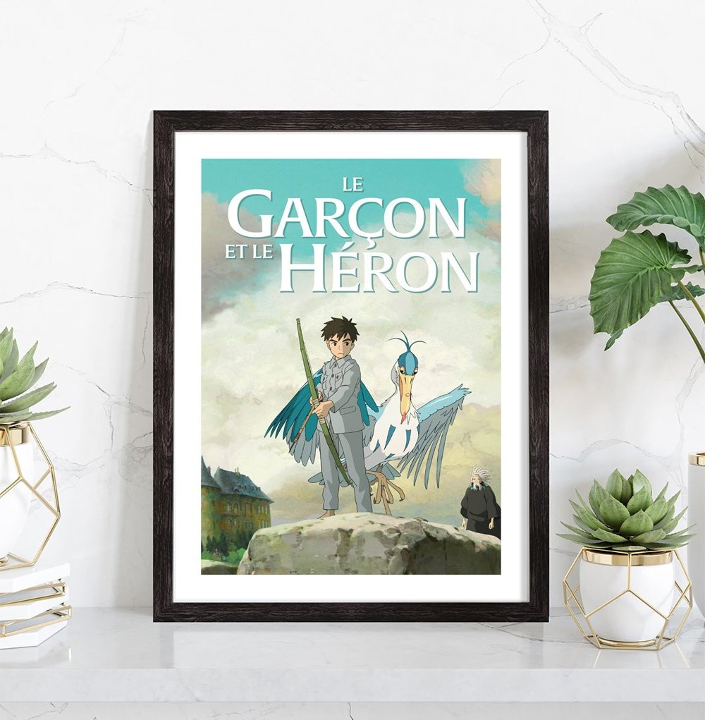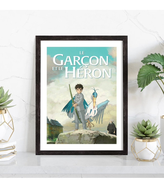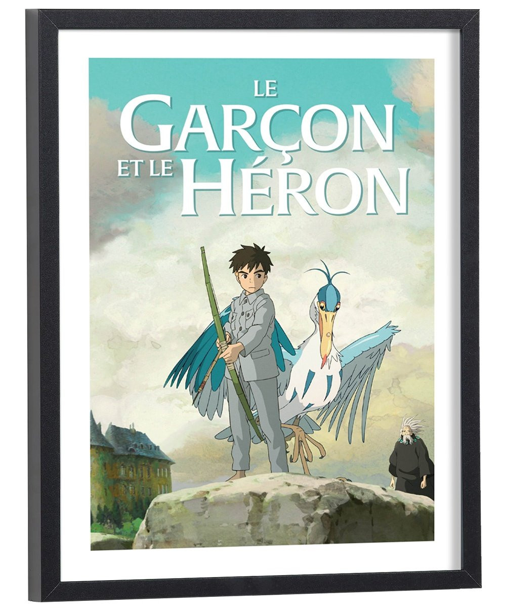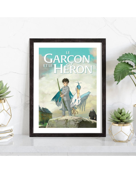 Affiche du film "Affiche film Le garçon et le héron" film d'animation japonais réalisé par Hayao Miyazaki . Affiche encadrée avec cadre en bois noir.