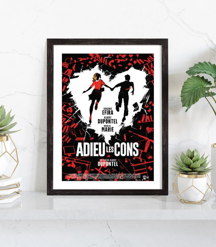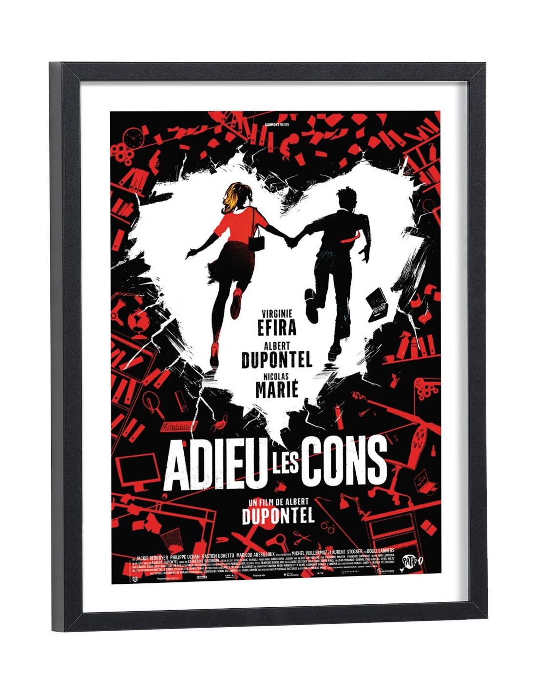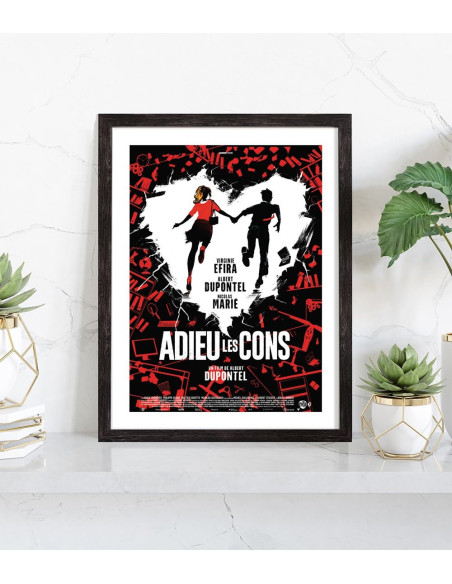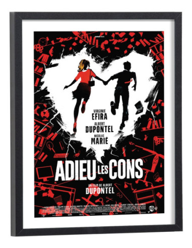 Affiche du film "Adieu les cons". Affiche encadrée avec cadre en bois noir.