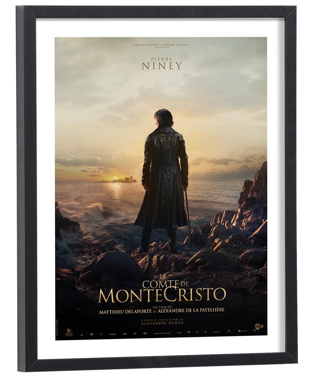 Affiche du film "Le Comte de Monte-Cristo" avec Pierre Niney. Affiche encadrée avec cadre en bois noir.