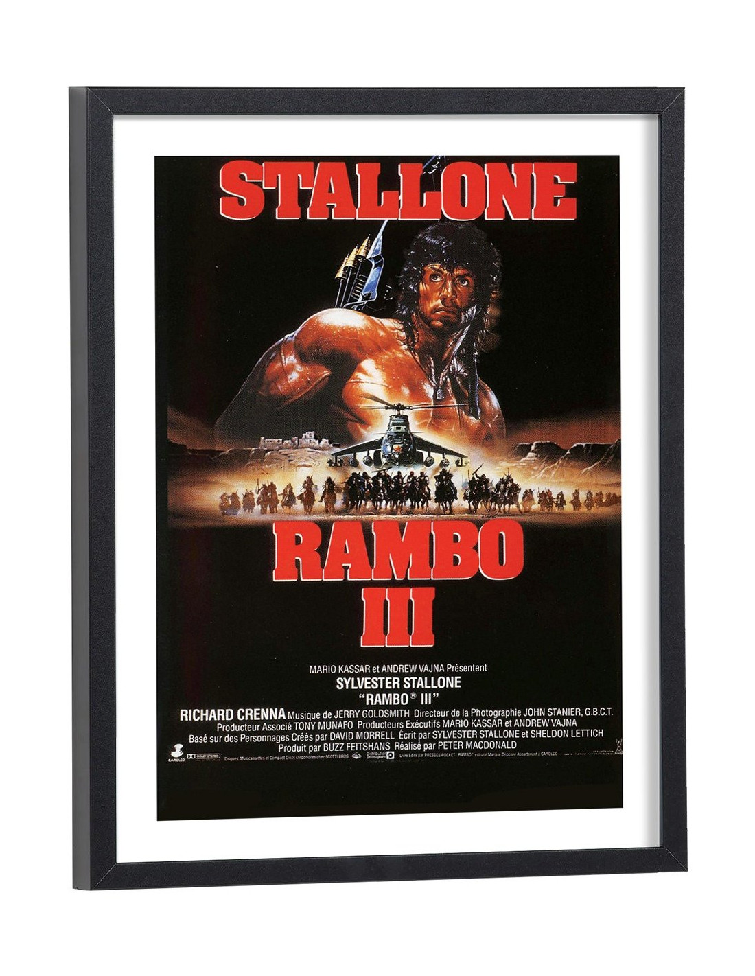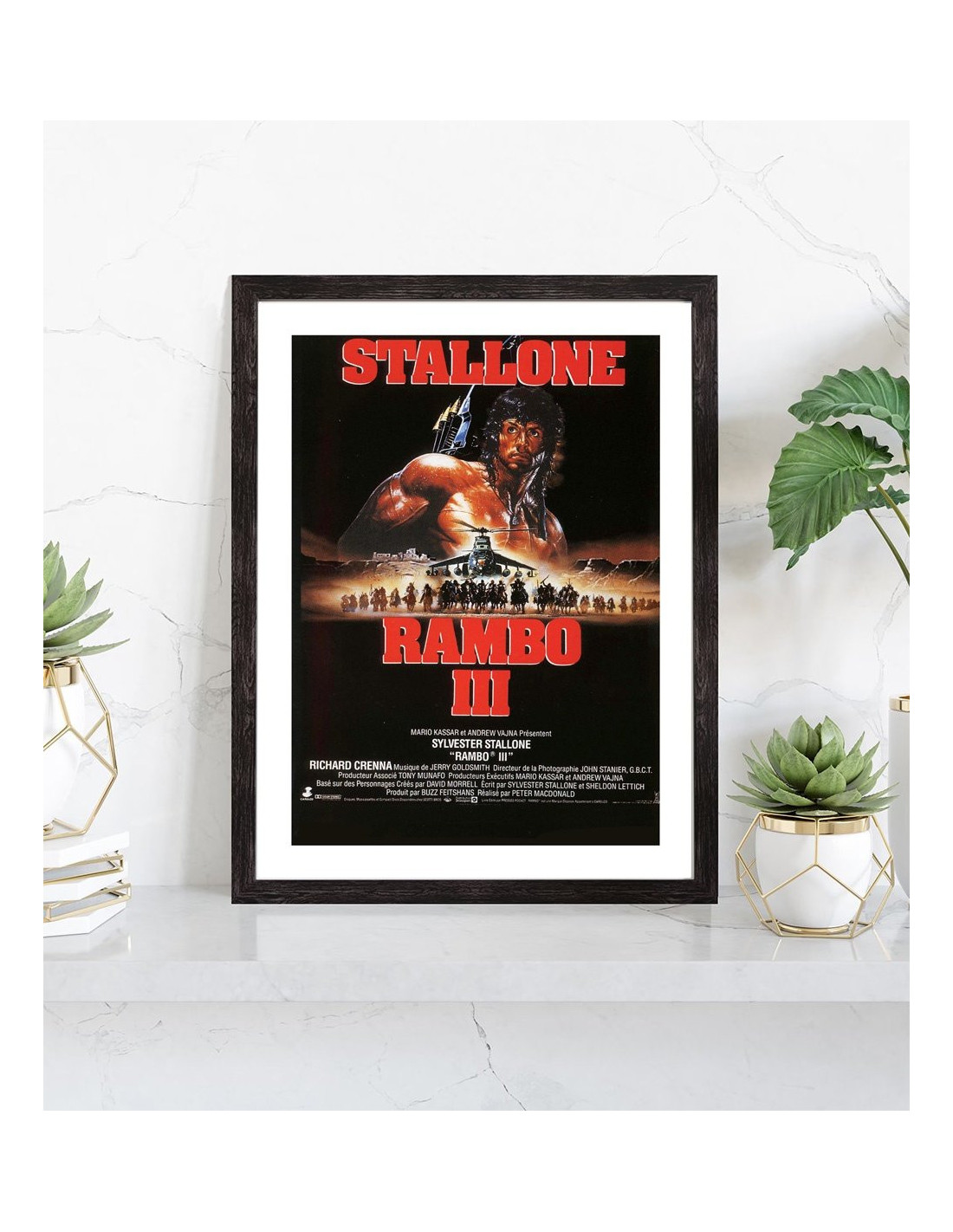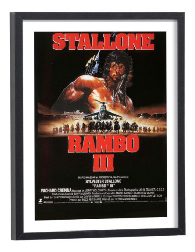 Affiche du film "Rambo 3" avec Sylvester Stallone. Affiche encadrée avec cadre en bois noir.
