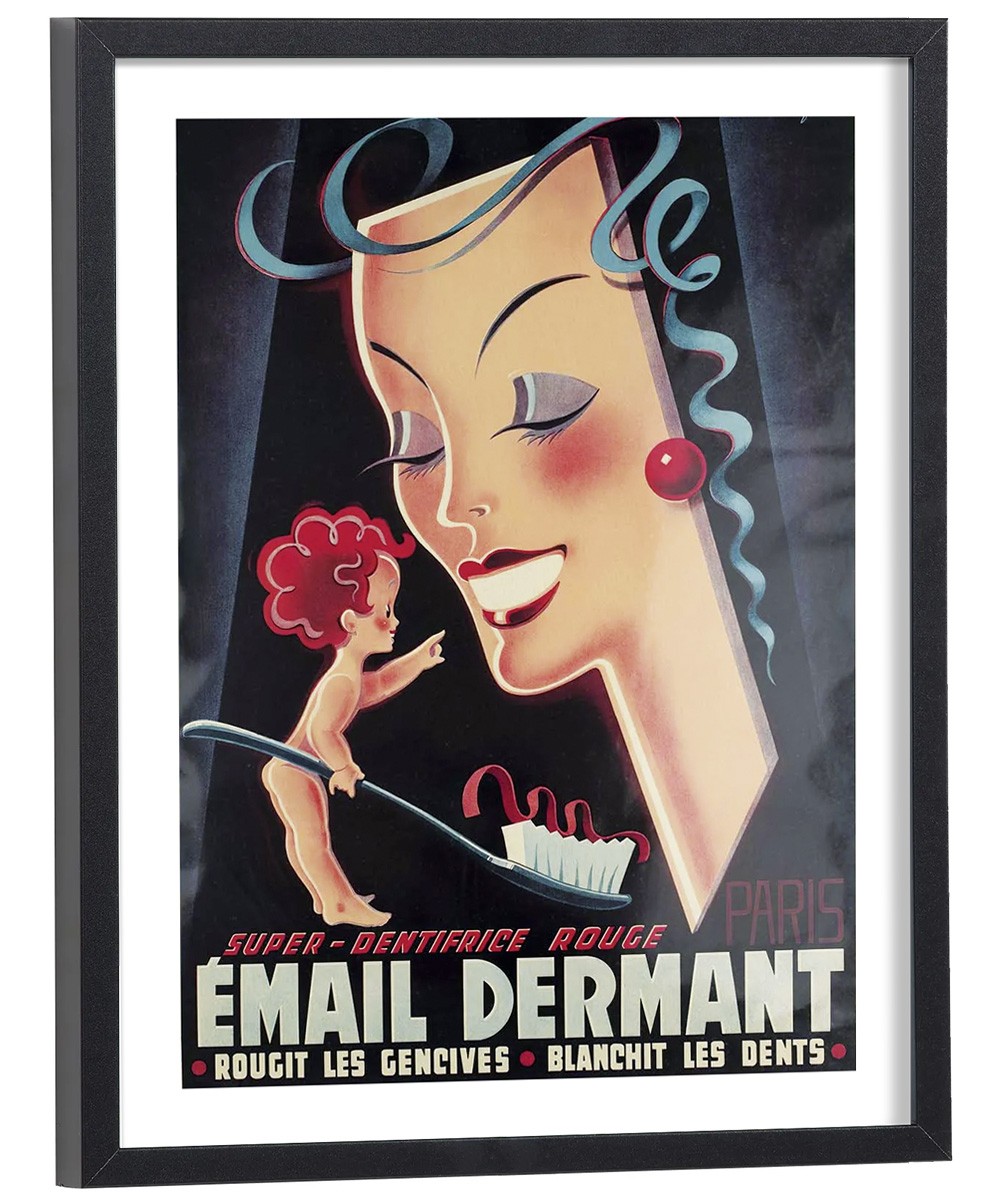 L'affiche Email Dermant révèle tout l'art de la publicité française d'antan avec son esthétique Art déco raffinée. Les teintes chaudes dominent la composition : chair nacrée, rouge vermillon et bleu-gris se mélangent sur un fond sombre pour créer une atmosphère sophistiquée. Le visage féminin stylisé, aux traits délicats et aux cheveux ondulés, incarne l'idéal de beauté des années 1930 tandis qu'un petit personnage tient une brosse à dents.