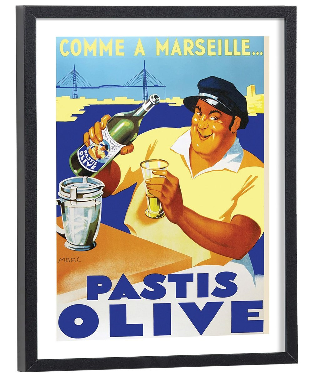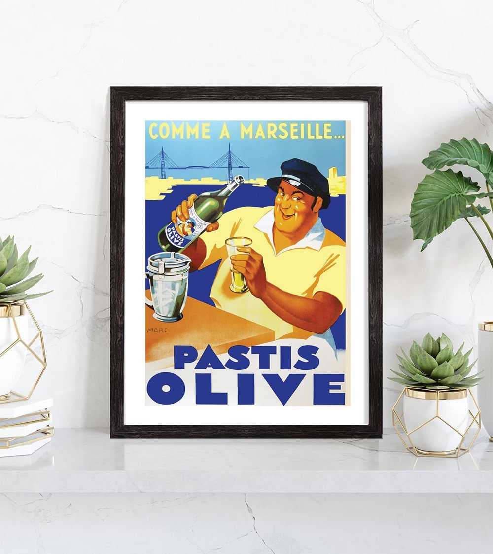 Tableau décoration de l'affiche publicitaire vintage "Pastis Olive". Affiche de publicité ancienne aux éditions Clouet. Affiche de cuisine vintage.
