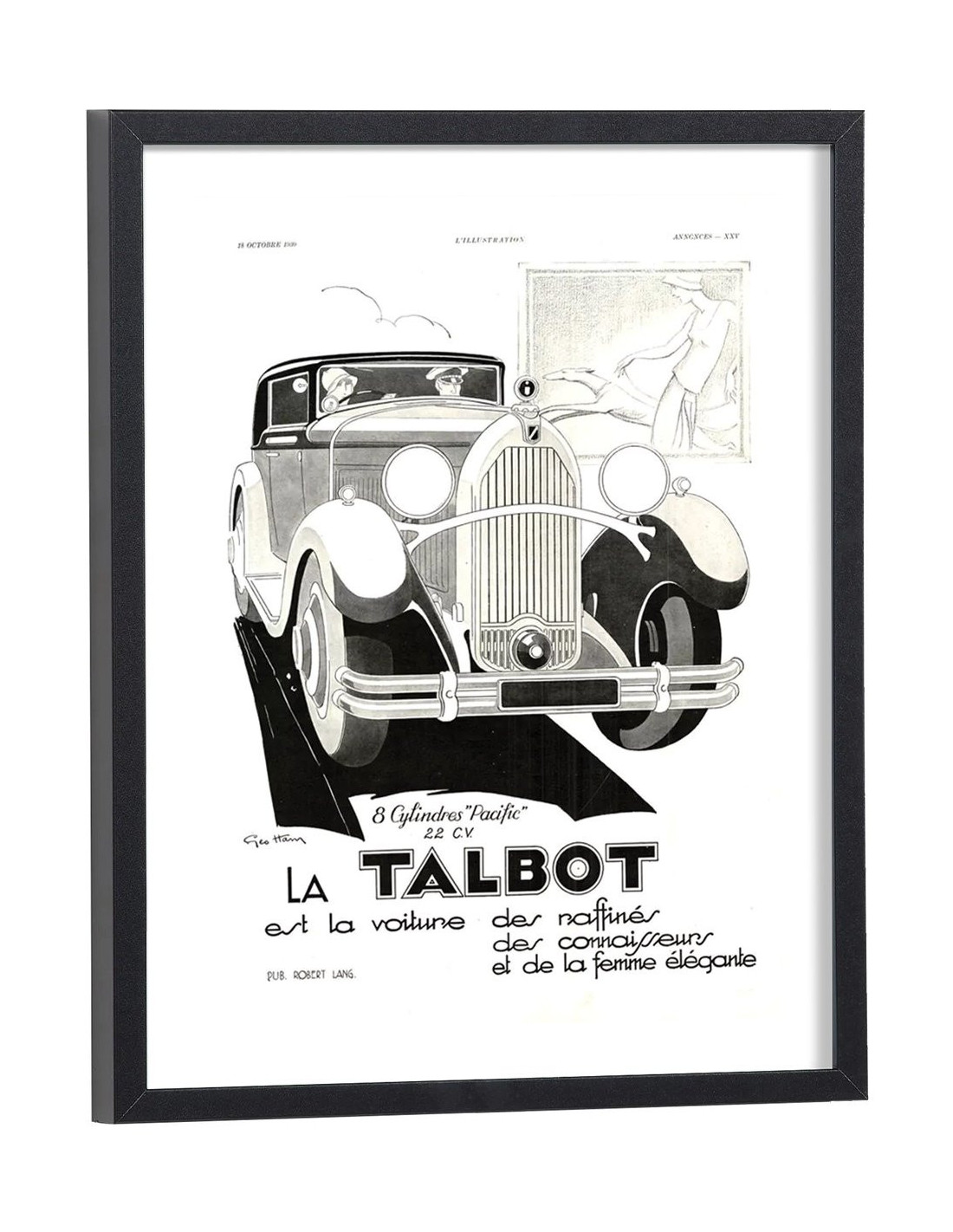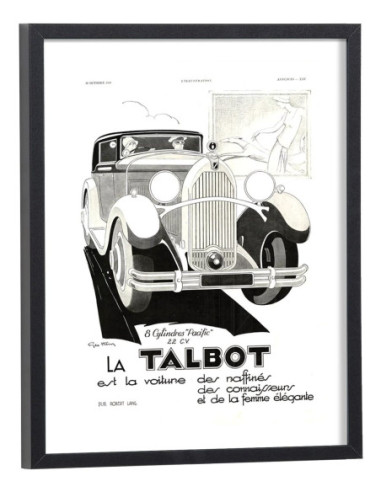 Tableau décoration de l'affiche publicitaire vintage automobile de la marque Talbot du 18 octobre 1930. On y voit le modèle 8 cylindres "Pacific" 22 C.V. ainsi que le slogan "La TALBOT est la voiture des raffinés, des connaisseurs et de la femme élégante.