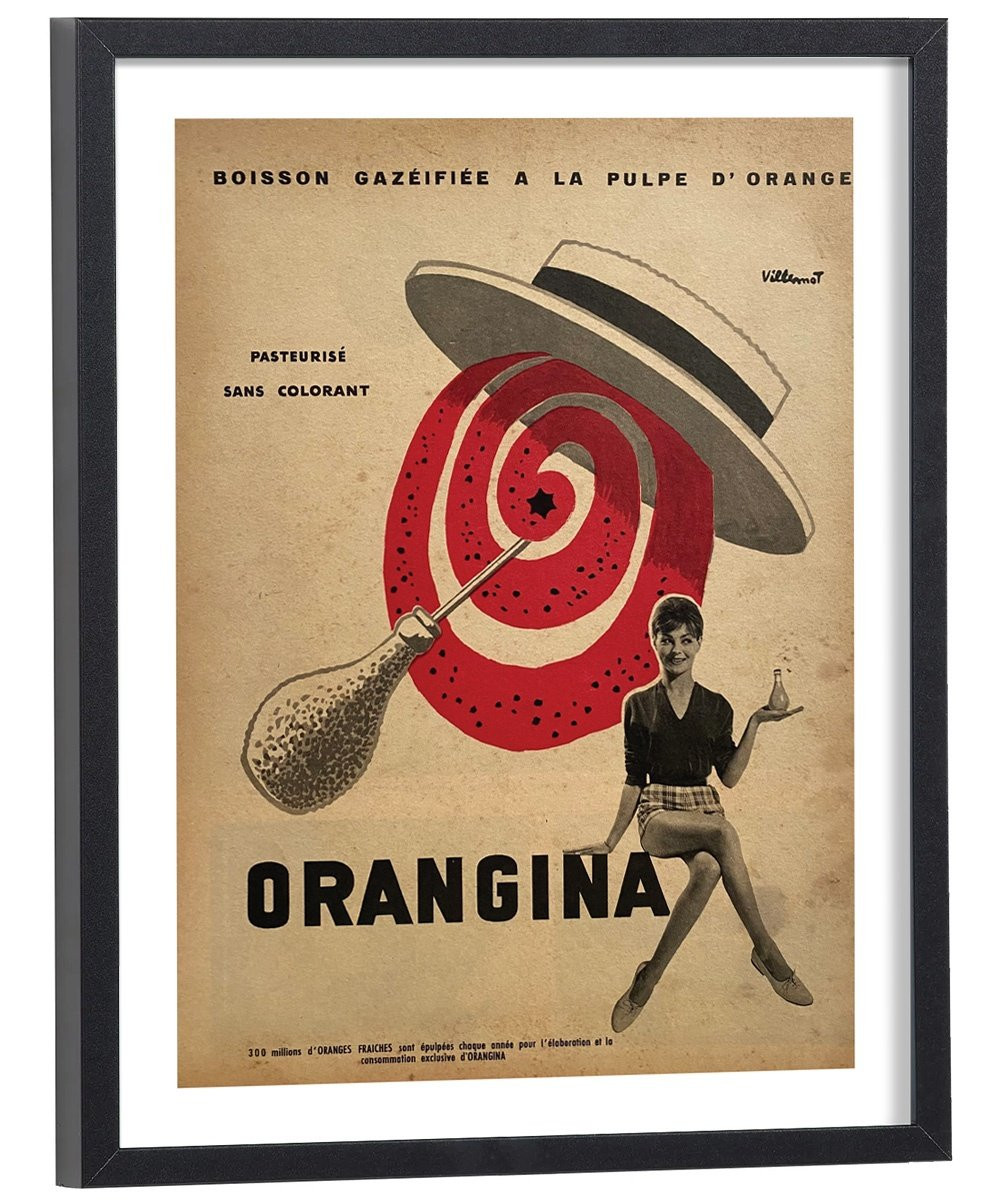 Tableau décoration d'une affiche publicitaire ancienne pour la boisson Orangina, réalisée en 1959. Affiche de cuisine vintage.