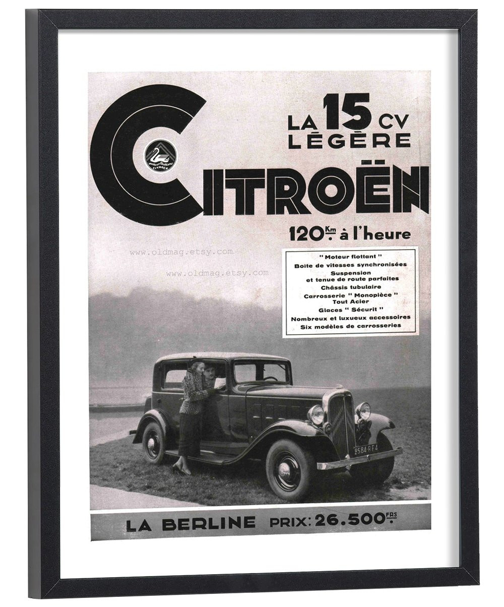 Tableau décoration de l'affiche publicitaire vintage "Citroën 15 CV" pour la Citroën Rosalie de 1932 - Collection.