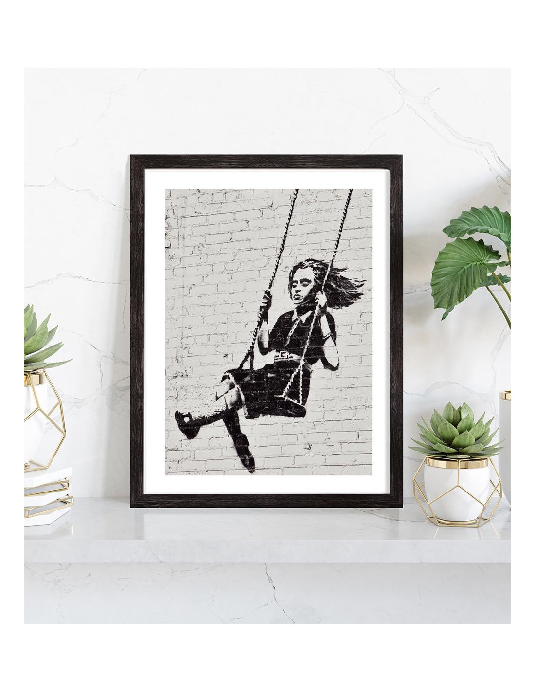 Tableau d'une oeuvre de Banksy réalisée en 2010 à Los Angeles. La petite fille sur sa balançoire.