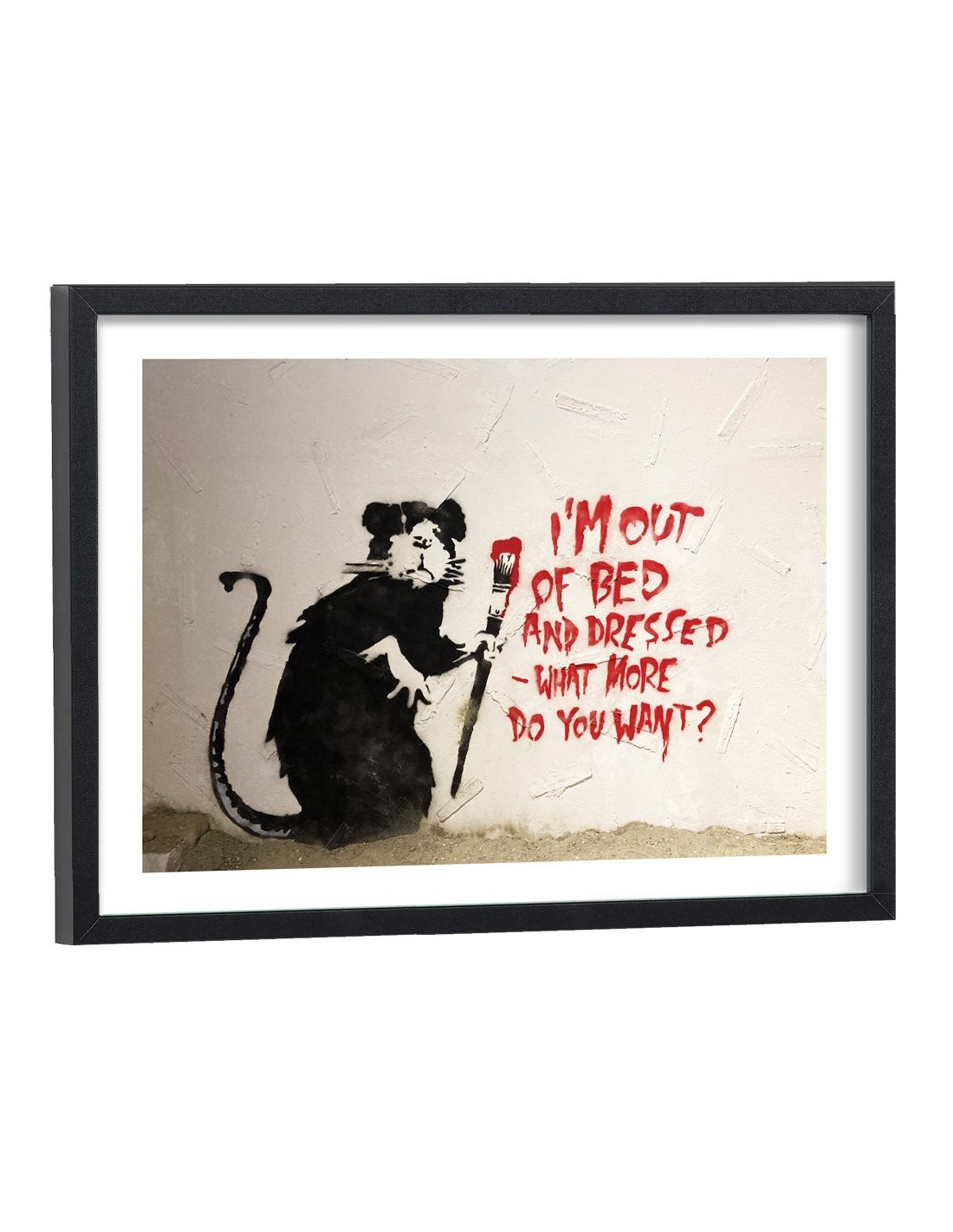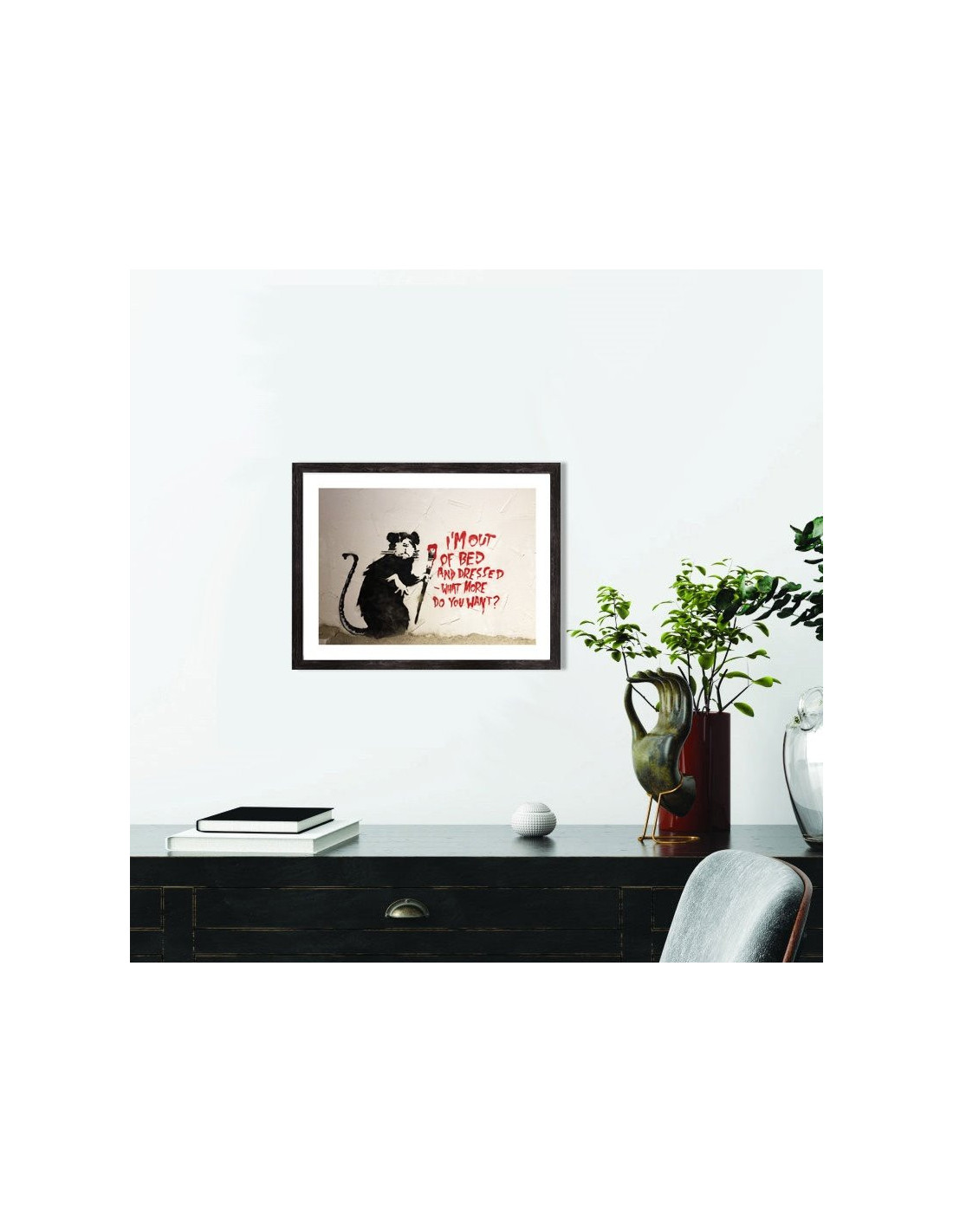 Affiche d'une oeuvre de Banksy représentant un rat et le message "I'm Out Of Bed What More Do You Want ?". Vendu avec encadrement en bois noir.