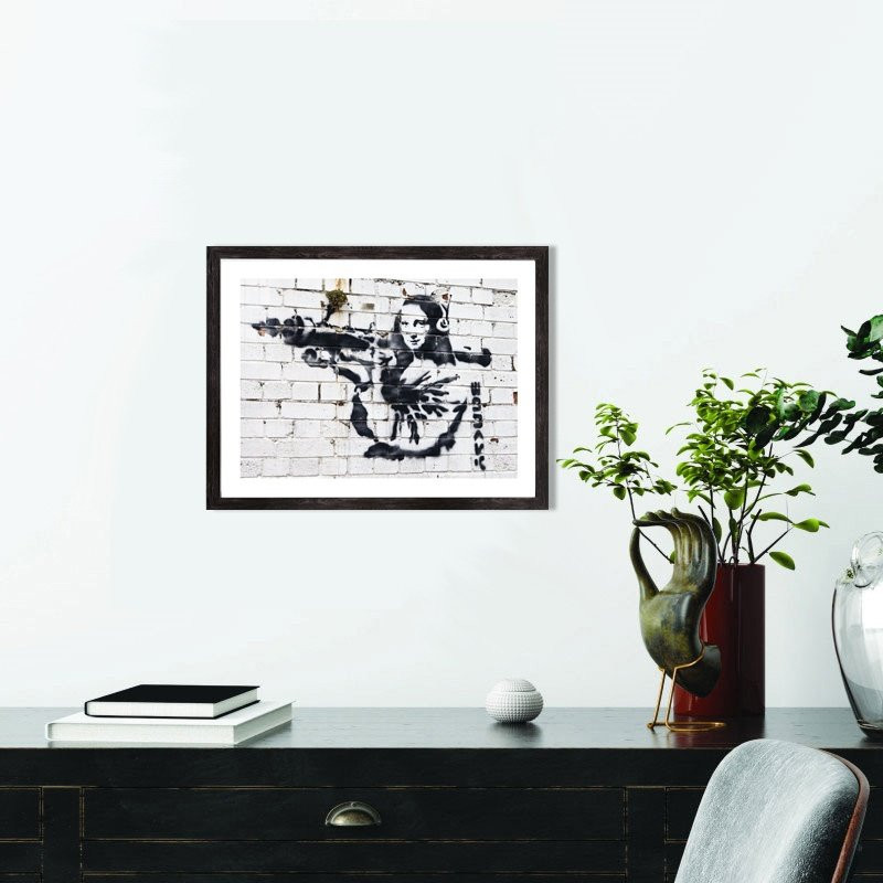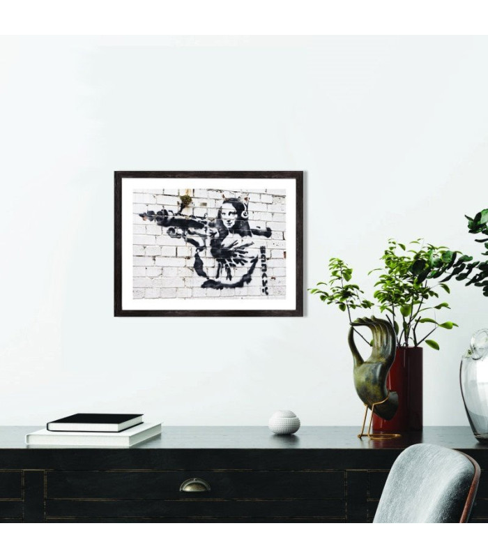 Affiche d'une oeuvre de Banksy. Mona Lisa avec un Bazooka, une des nombreuses œuvres de l'artiste. Vendu avec encadrement en bois noir.