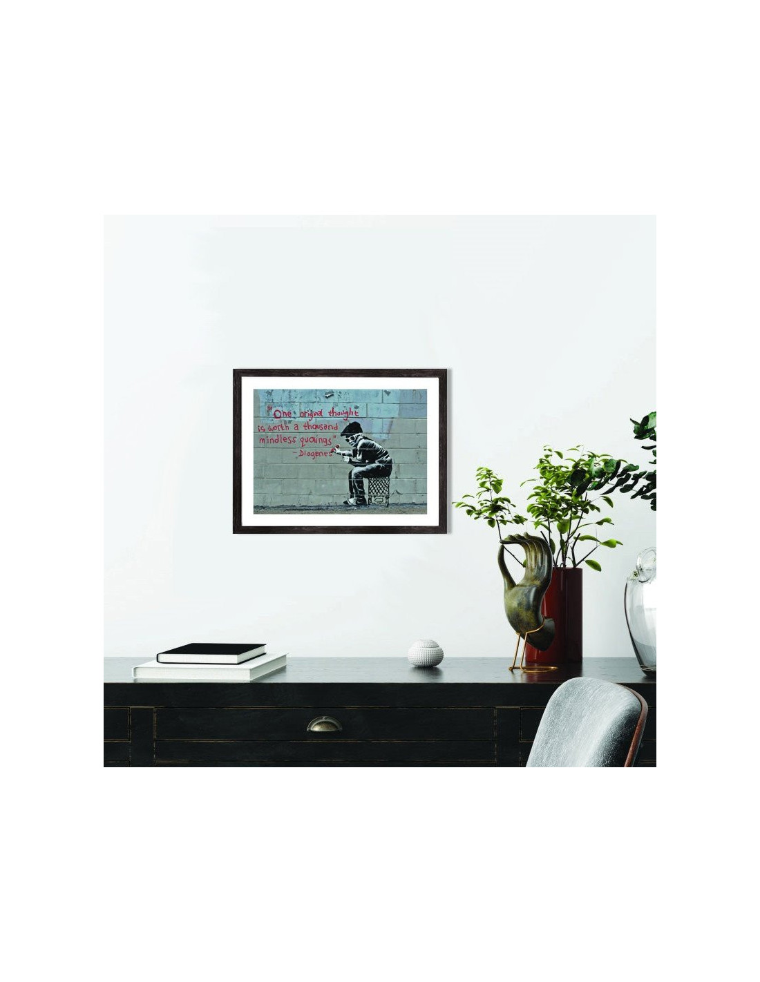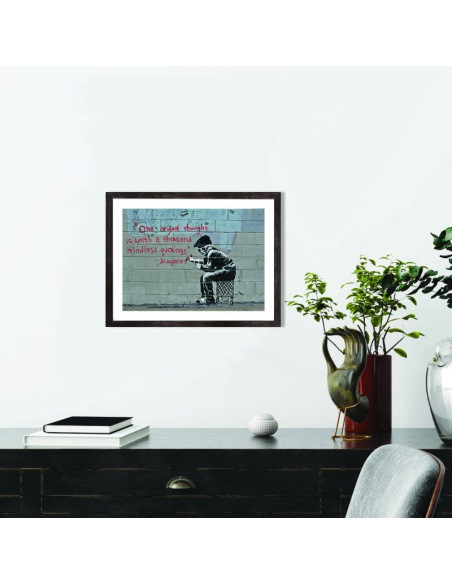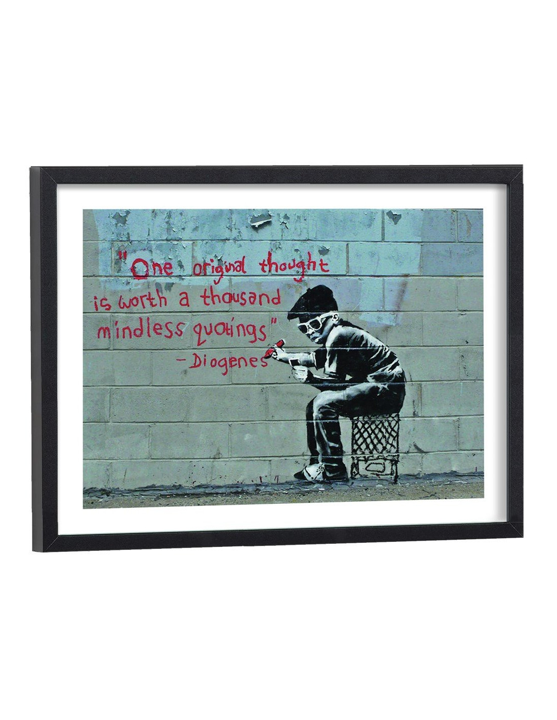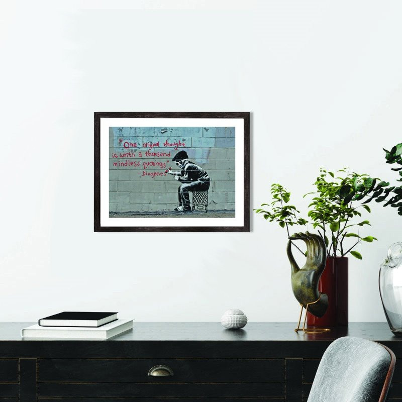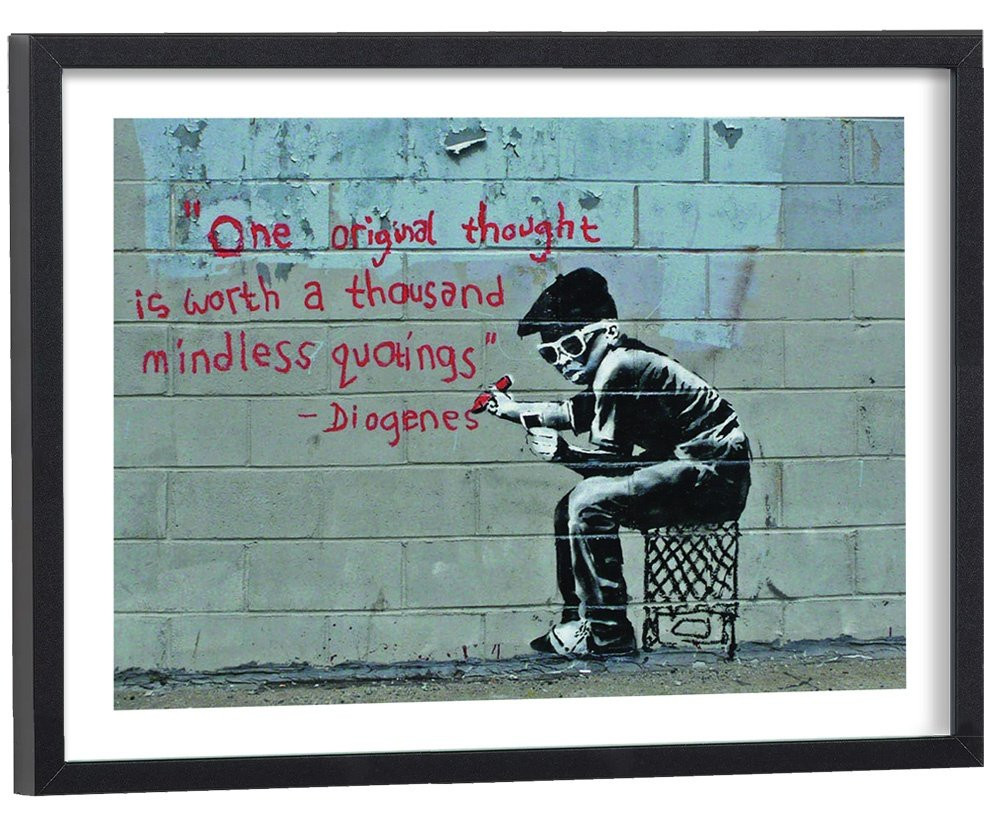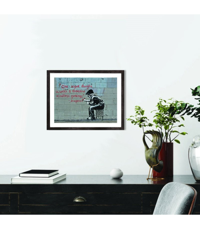 Affiche d'une oeuvre de Banksy avec une citation de Diogenes : "One original thought is worth athousand mindless quotings". Vendu avec encadrement en bois noir.