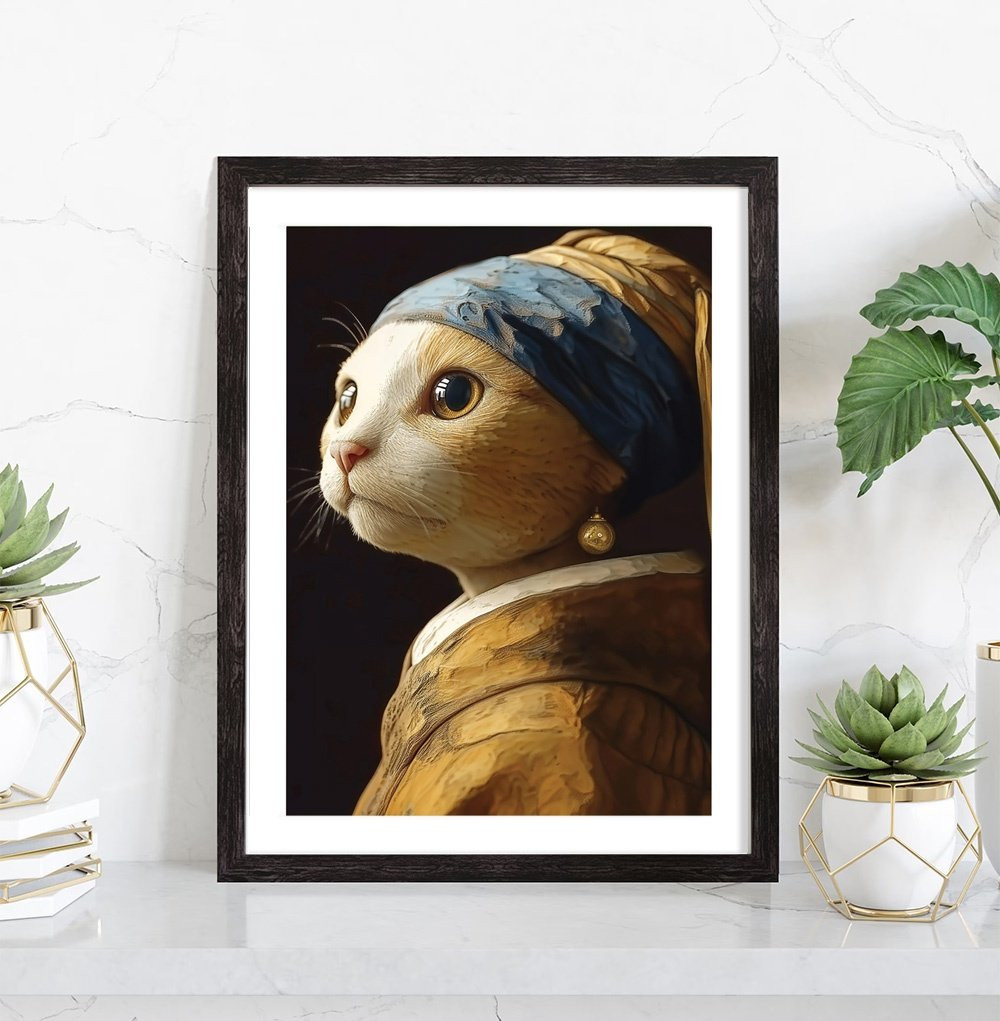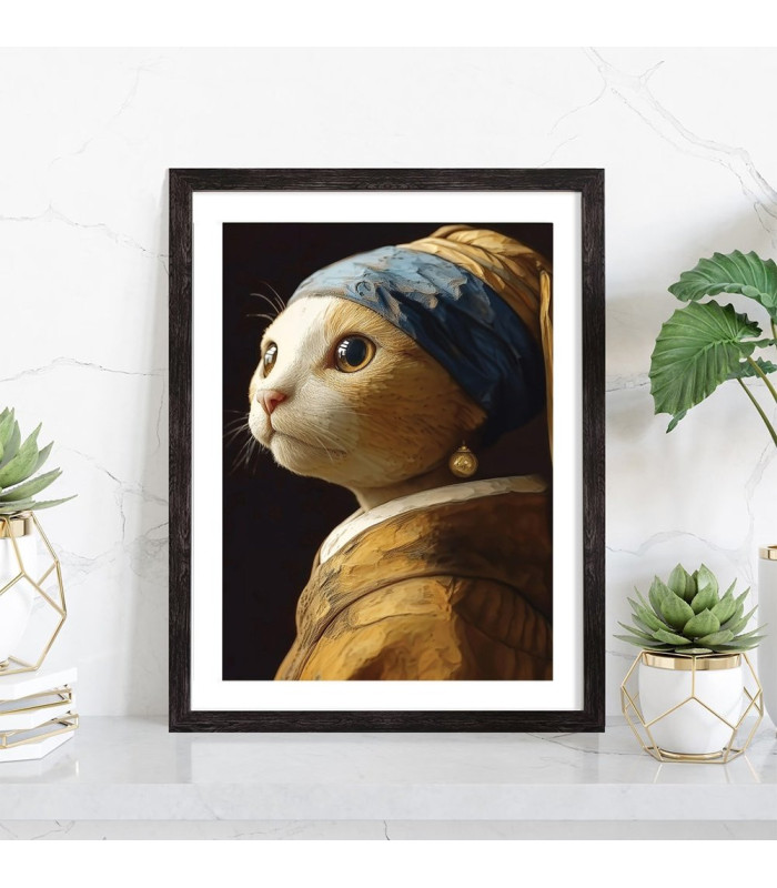 Tableau décoration mural d'un chat dans le style d'une reproduction de Vermeer (La jeune fille à la perle).