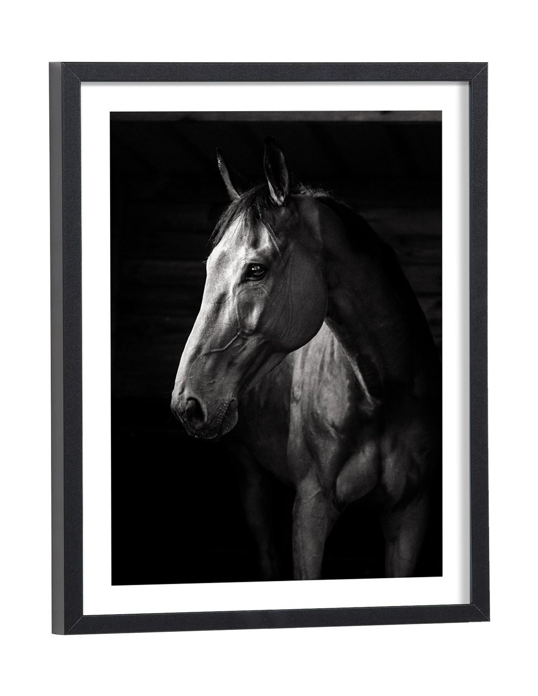 Tableau décoration noir et blanc de cheval. Tableau composé d'une affiche de cheval en noir et blanc et d'un cadre en bois.