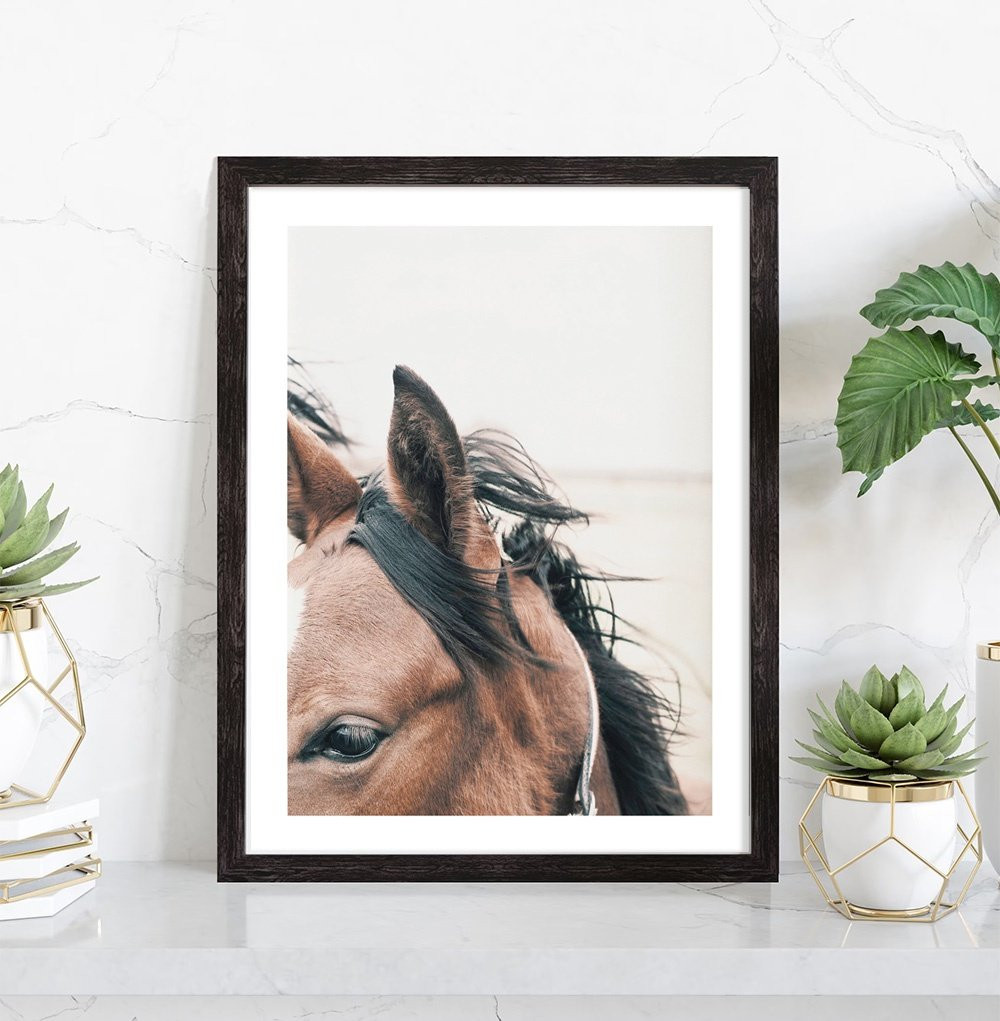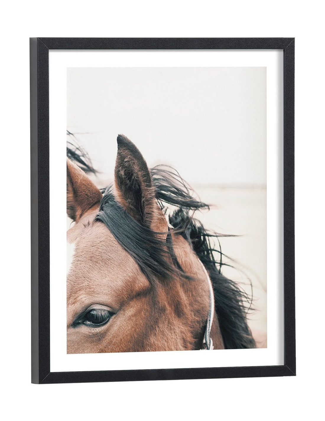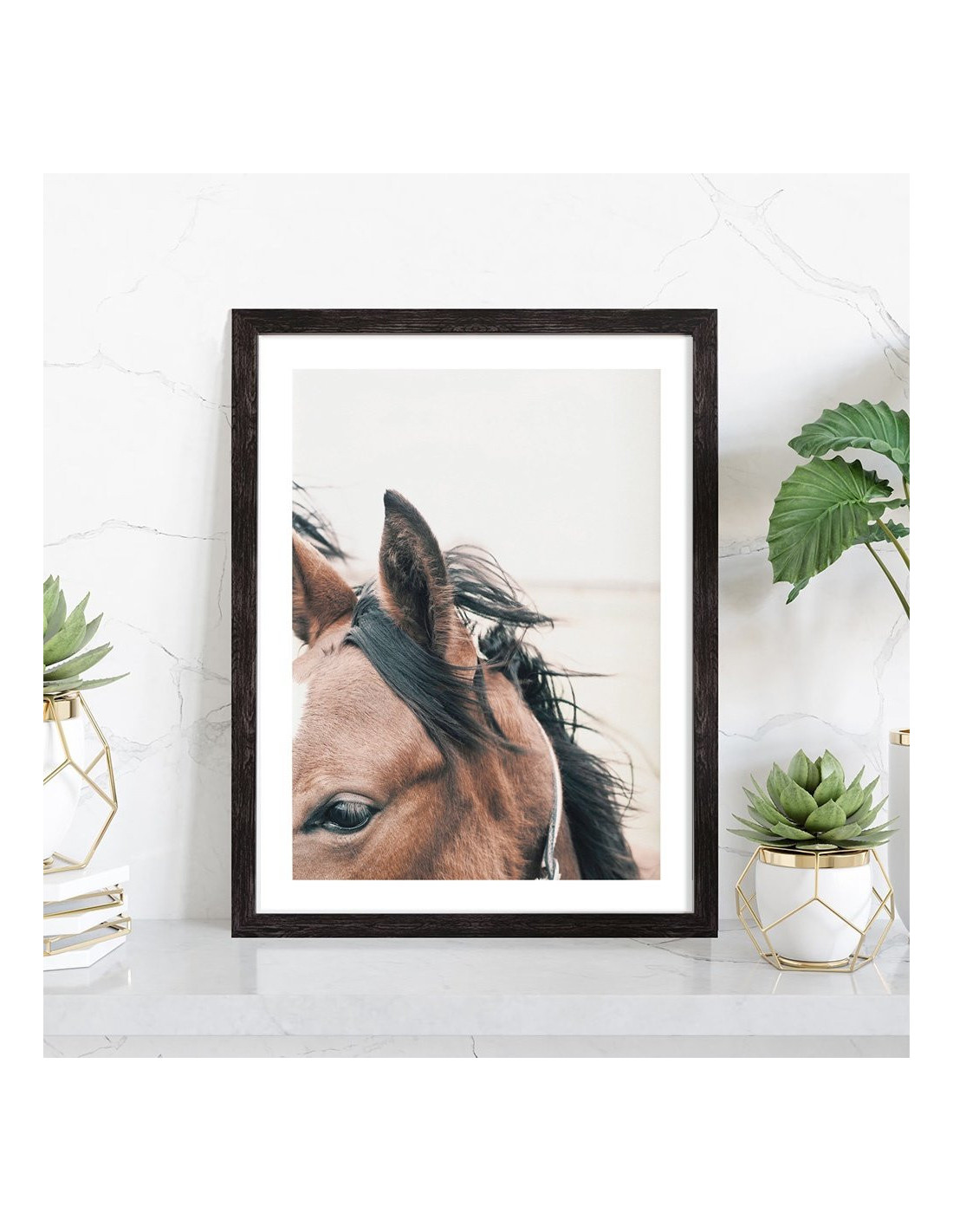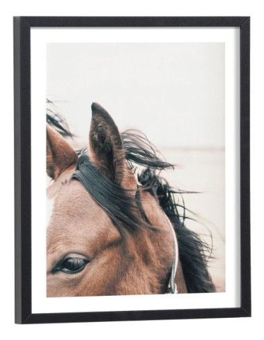 Tableau décoration d'une tête de cheval en gros plan avec un zoom sur les oreilles. Affiche colorée avec encadrement.