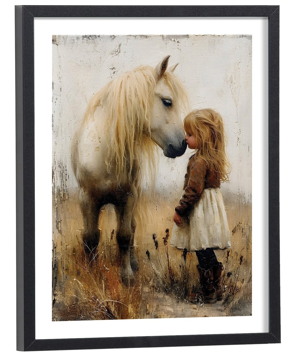 Tableau décoration d'impression d'une peinture de cheval avec petite fille. Idéal pour décoration de chambre d'enfant.