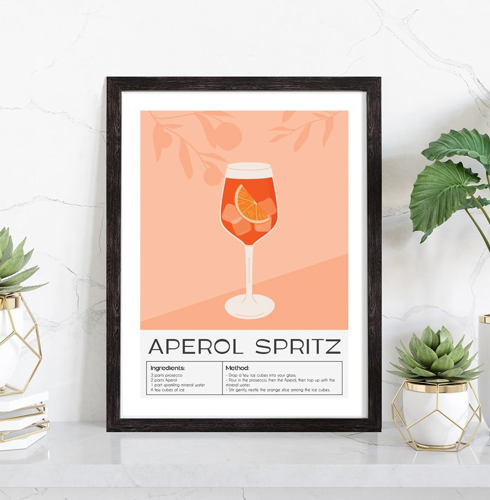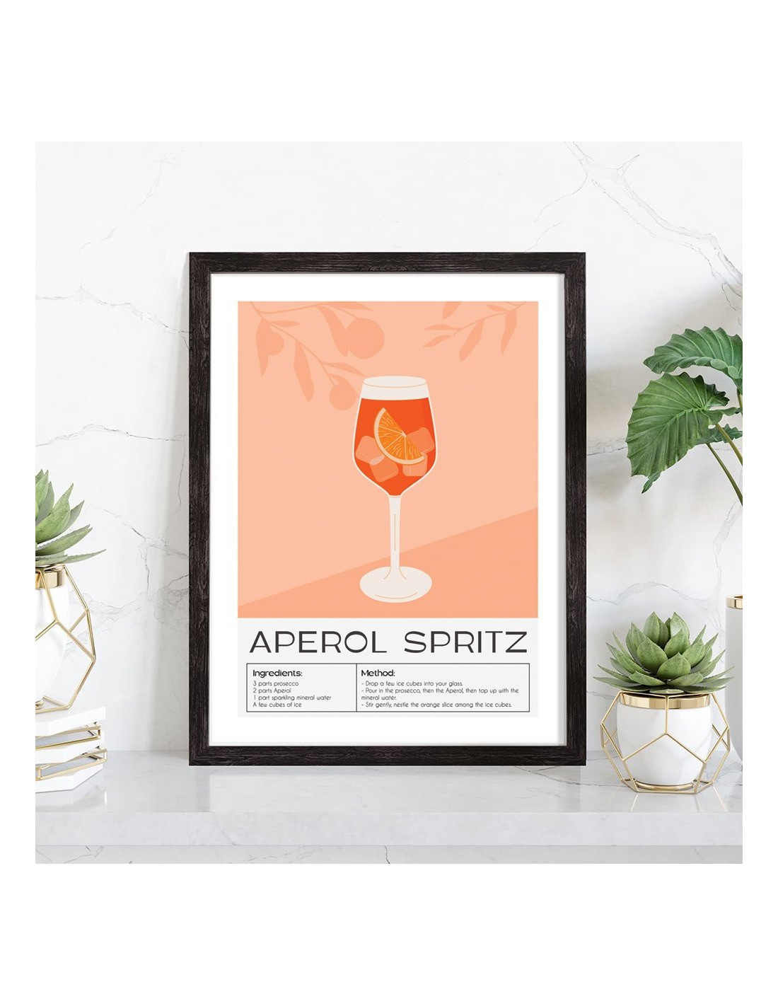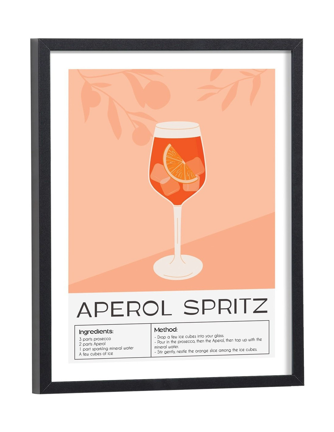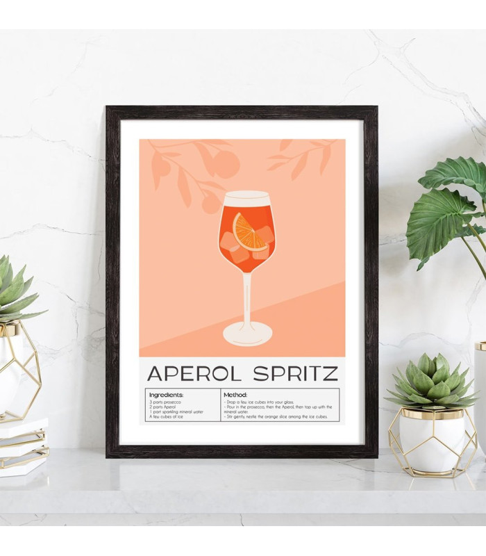 Affiche décoration du célèbre cocktail Aperol Spritz. Découvrez cette belle affiche vintage colorée qui contient une image du verre avec le cocktail Aperol Spritz, les ingrédients utilisés ainsi que la recette de ce cocktail. L'affiche est vendue avec l'encadrement.