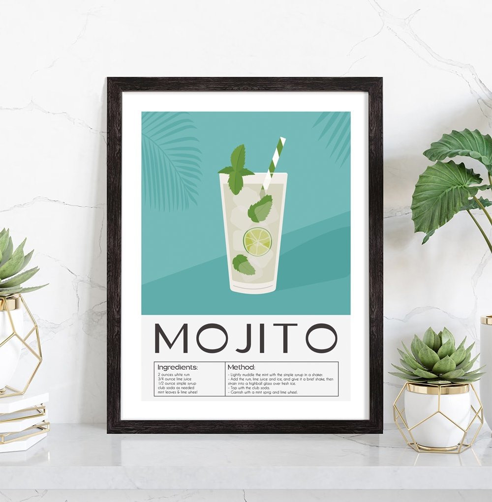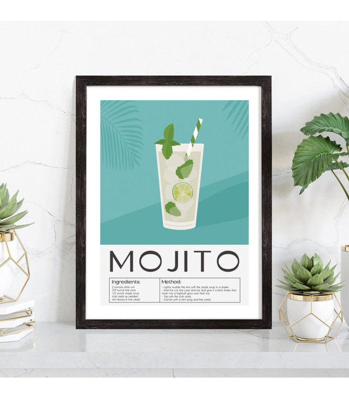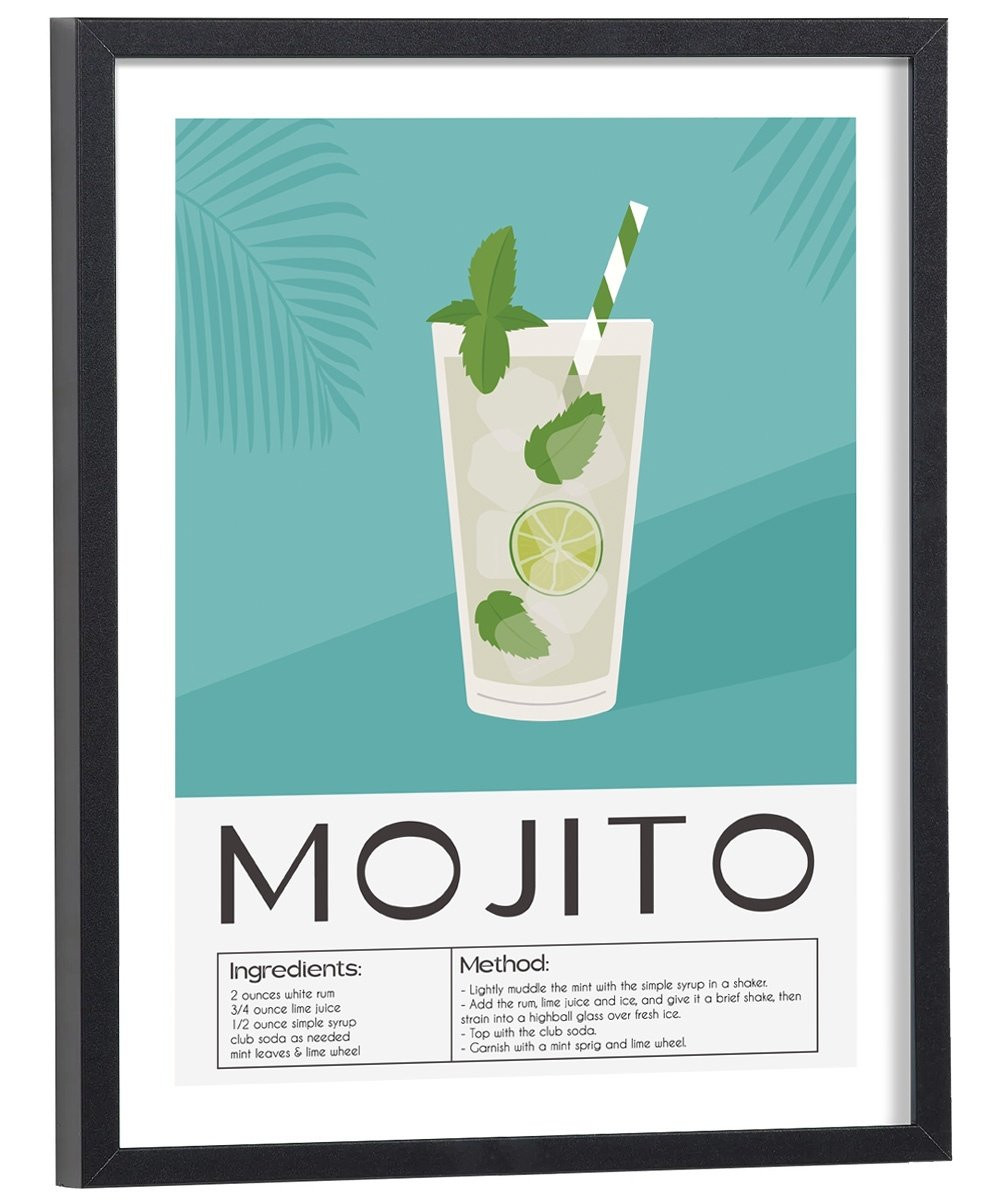 Affiche décoration du cocktail Mojito. Découvrez cette belle affiche vintage colorée qui contient une image du verre avec le Mojito, les ingrédients utilisés ainsi que la recette de ce cocktail. L'affiche est vendue avec l'encadrement.