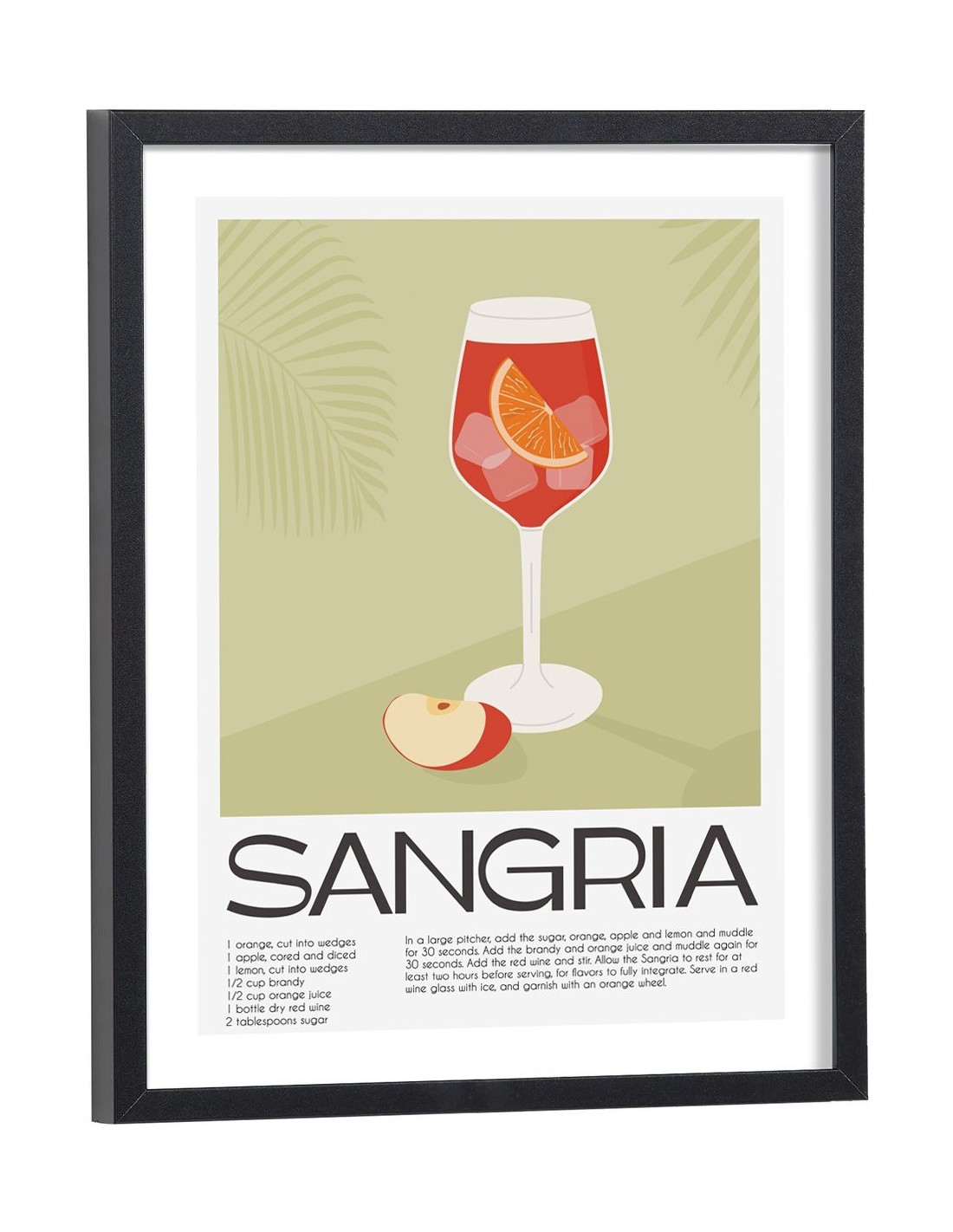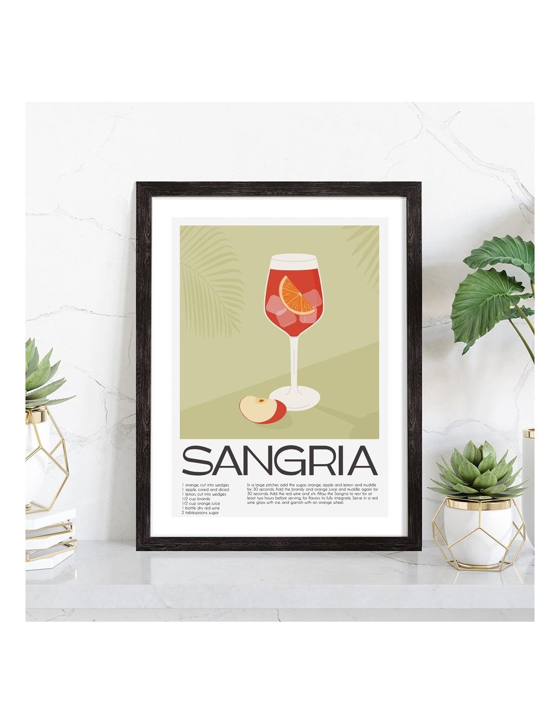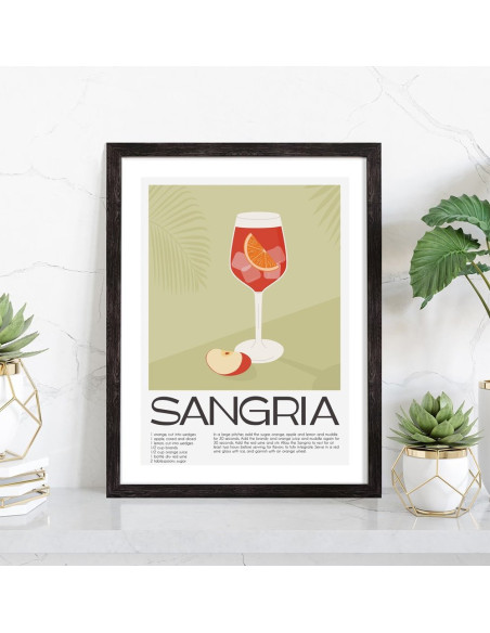 Affiche décoration du célèbre cocktail espagnol, la sangria. Découvrez cette belle affiche vintage colorée qui contient une image du verre avec le cocktail Sangria, les ingrédients utilisés ainsi que la recette de ce cocktail. L'affiche est vendue avec l'encadrement.