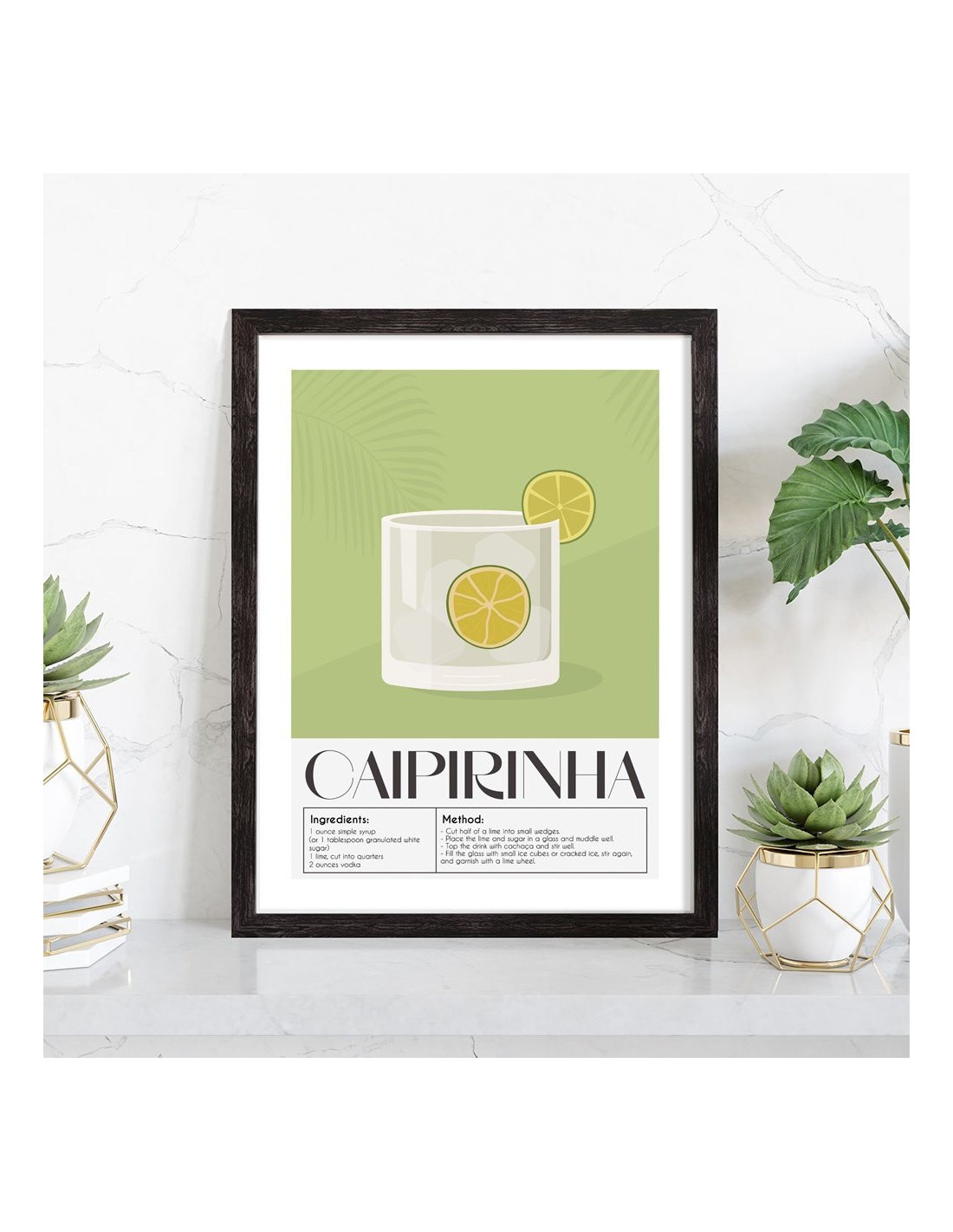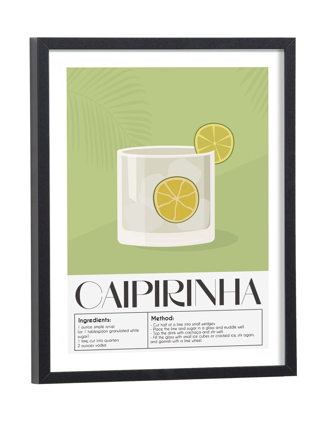 Affiche décoration du cocktail Caipirinha. Découvrez cette belle affiche vintage colorée qui contient une image du verre avec le cocktail Caipirinha, les ingrédients utilisés ainsi que la recette de ce cocktail. L'affiche est vendue avec l'encadrement.