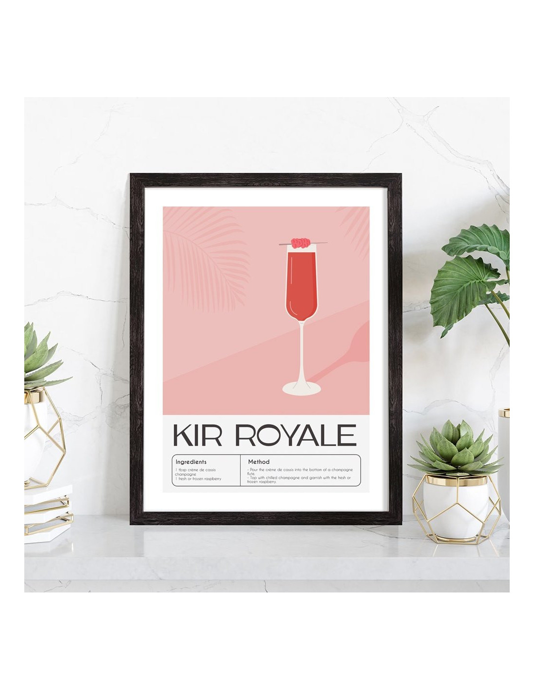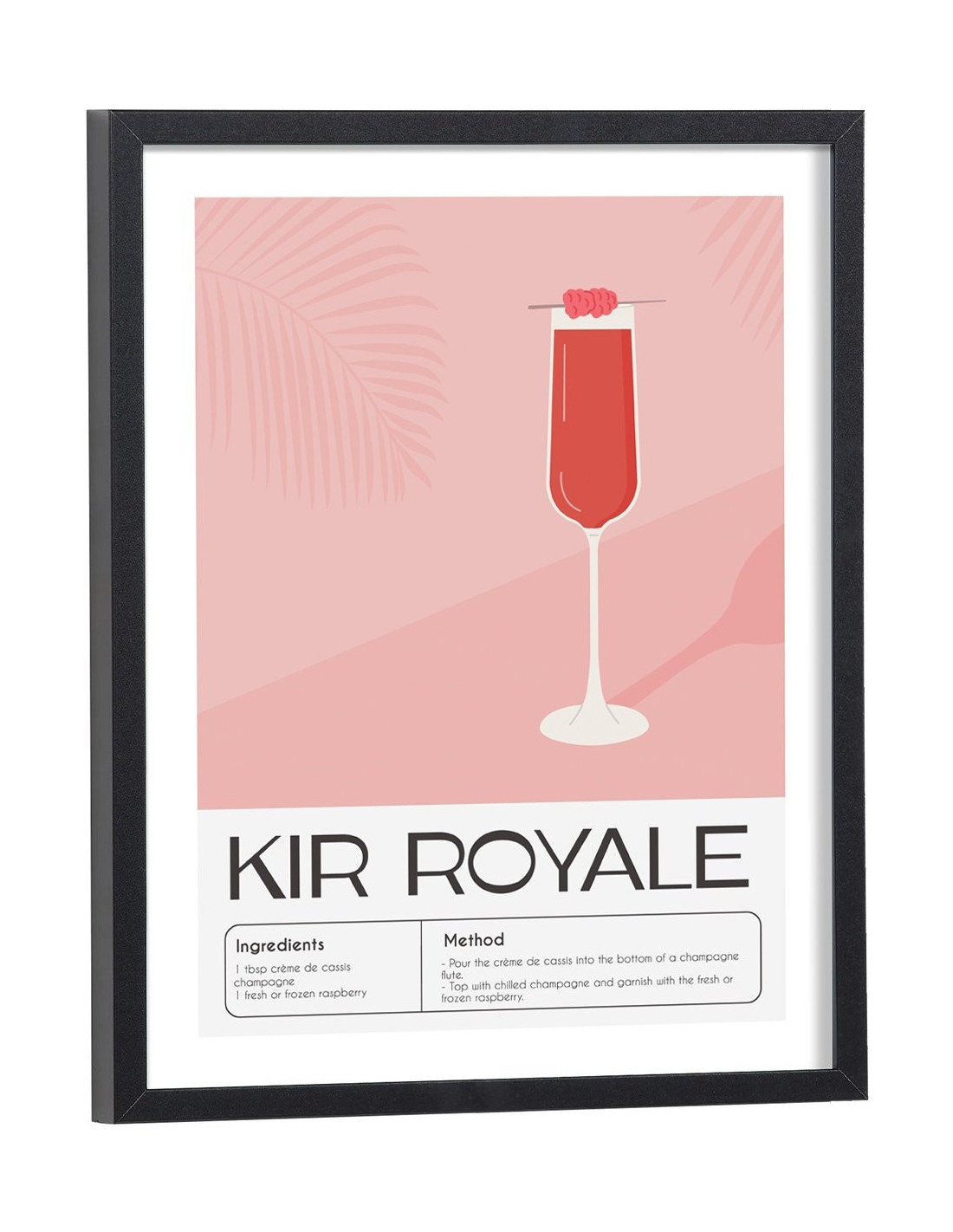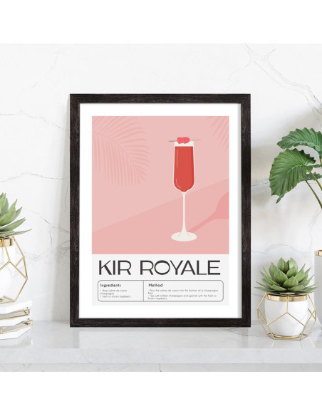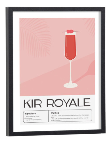 Affiche décoration du célèbre cocktail Kir Royale. Découvrez cette belle affiche vintage colorée qui contient une image du verre avec le cocktail Kir royale, les ingrédients utilisés ainsi que la recette de ce cocktail. L'affiche est vendue avec l'encadrement.