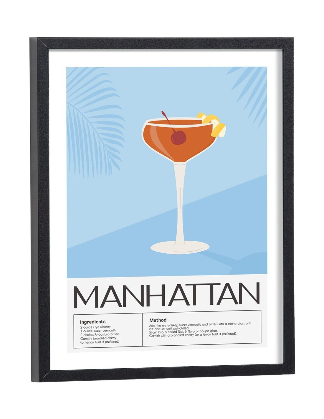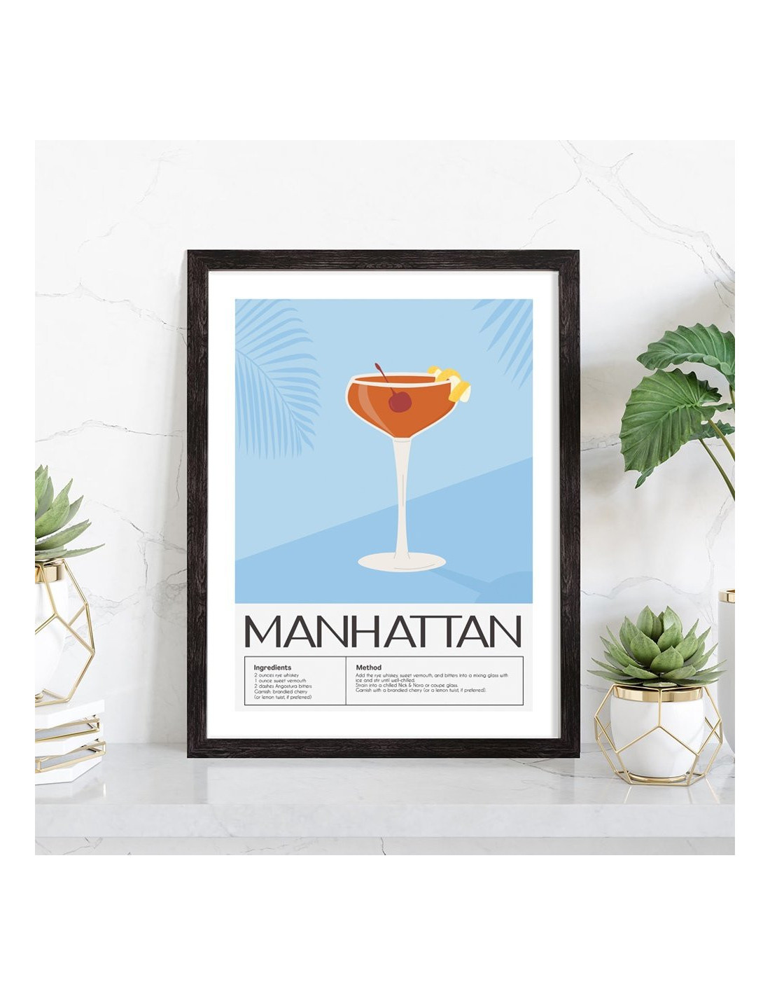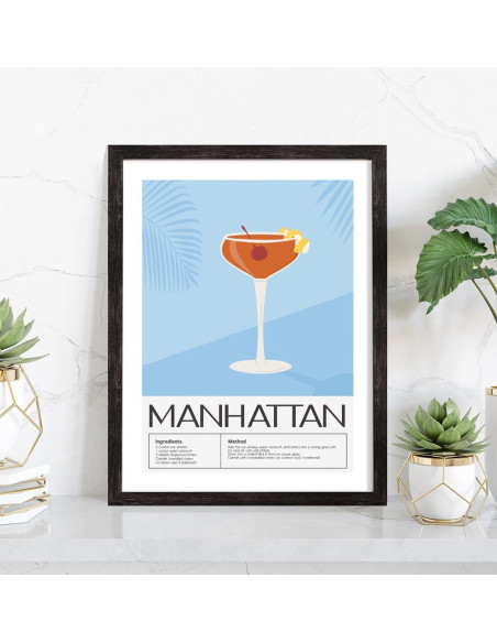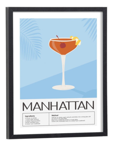 Affiche décoration du célèbre cocktail Manhattan. Découvrez cette belle affiche vintage colorée qui contient une image du verre avec le cocktail Manhattan, les ingrédients utilisés ainsi que la recette de ce cocktail. L'affiche est vendue avec l'encadrement.