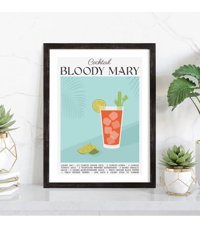 Affiche décoration du célèbre cocktail Bloody Mary. Découvrez cette belle affiche vintage colorée qui contient une image du verre avec le cocktail Bloody Mary, les ingrédients utilisés ainsi que la recette de ce cocktail. L'affiche est vendue avec l'encadrement.