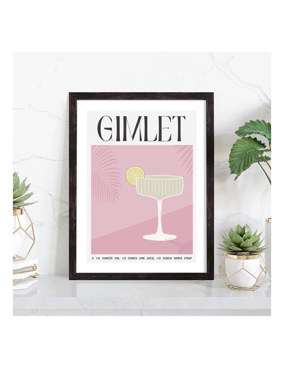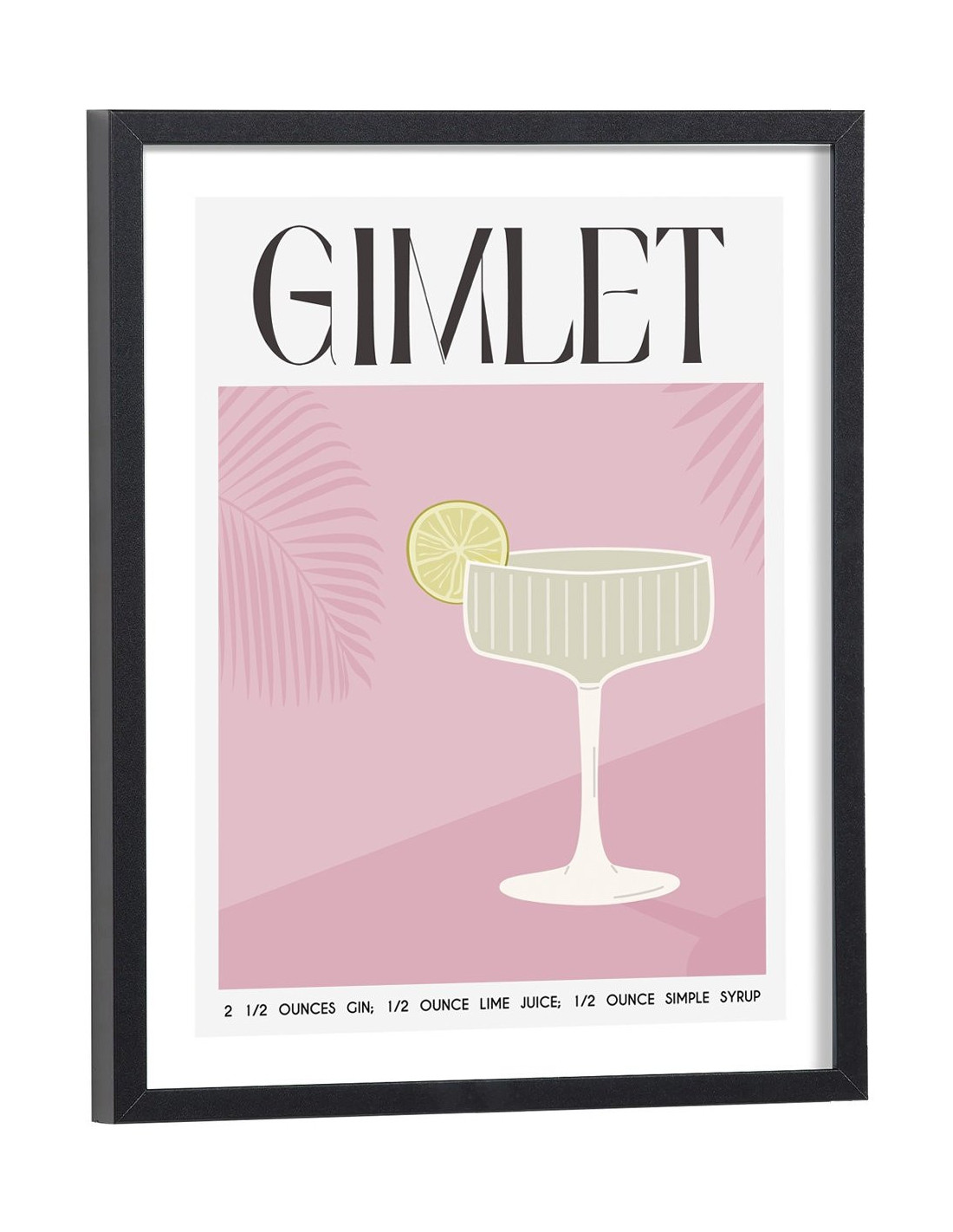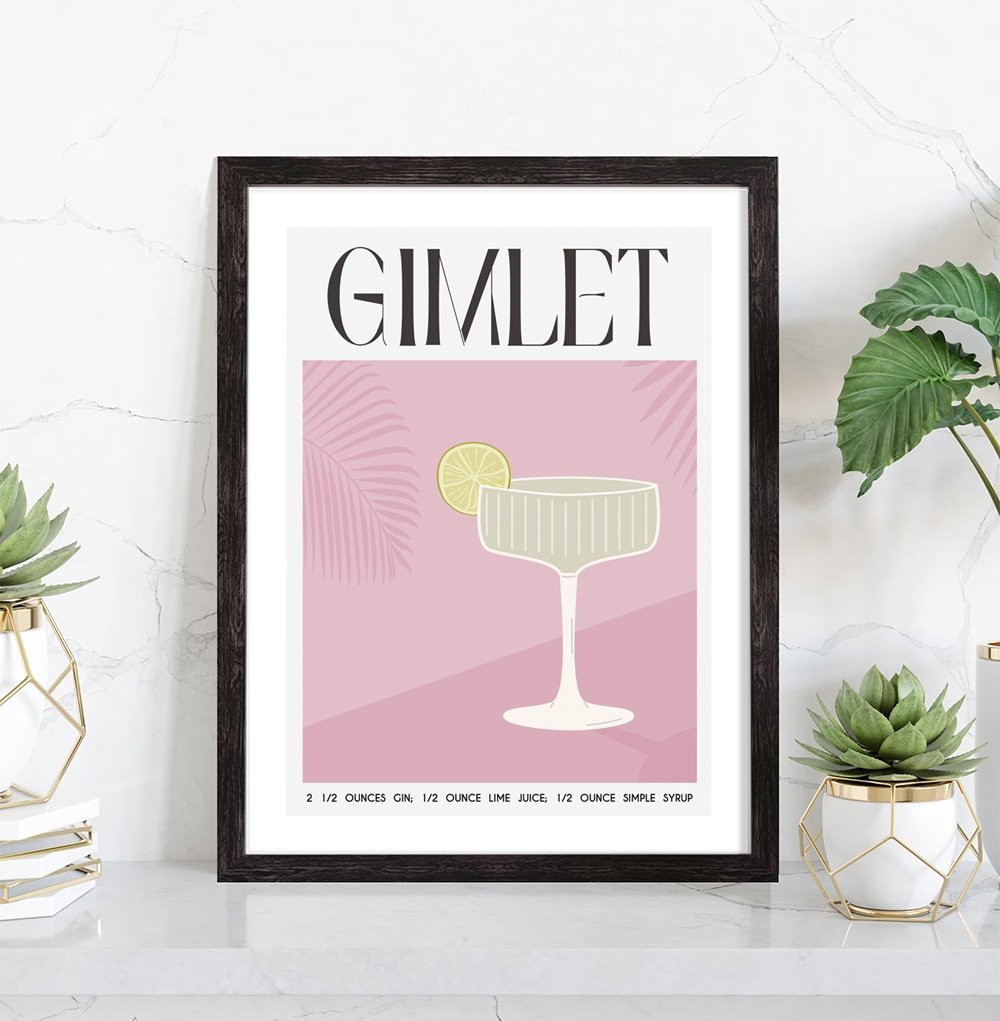 Affiche décoration du célèbre cocktail Gimlet. Découvrez cette belle affiche vintage colorée qui contient une image du verre avec le cocktail Gimlet, les ingrédients utilisés ainsi que la recette de ce cocktail. L'affiche est vendue avec l'encadrement.