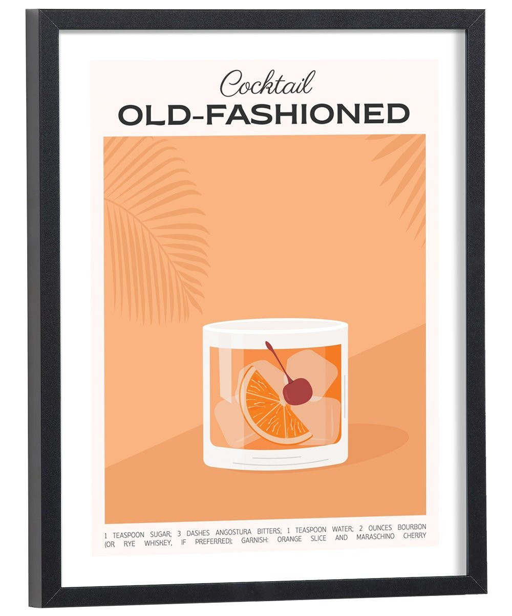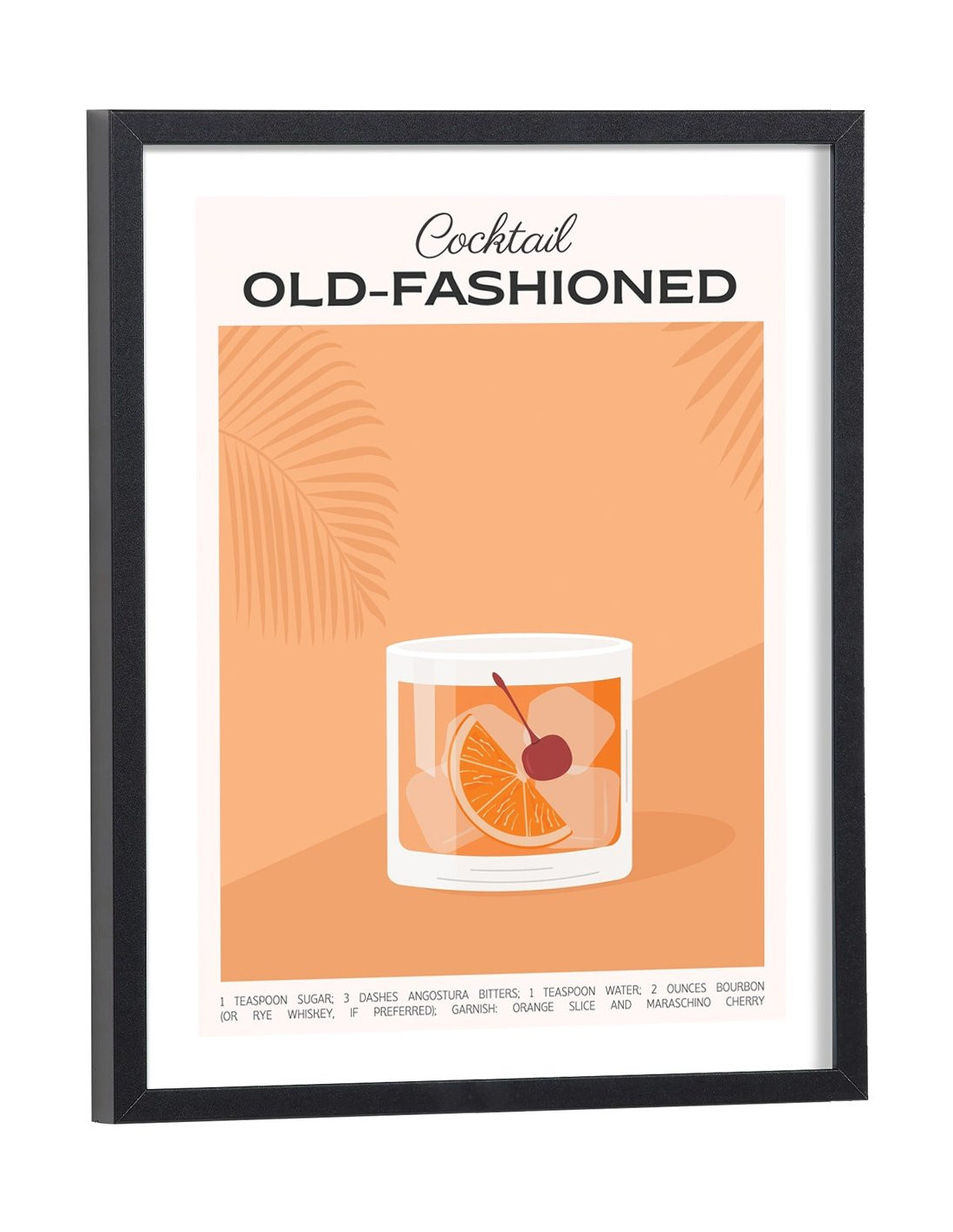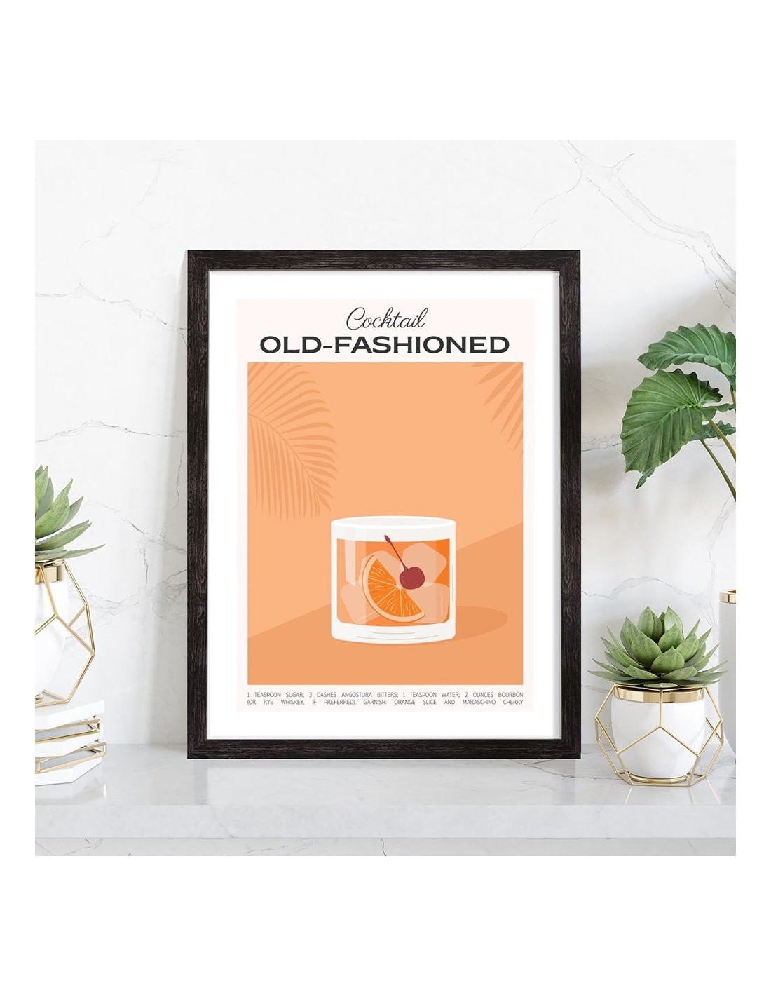 Affiche décoration du célèbre cocktail Old Fashioned. Découvrez cette belle affiche vintage colorée qui contient une image du verre avec le cocktail Old Fashioned, les ingrédients utilisés ainsi que la recette de ce cocktail. L'affiche est vendue avec l'encadrement.