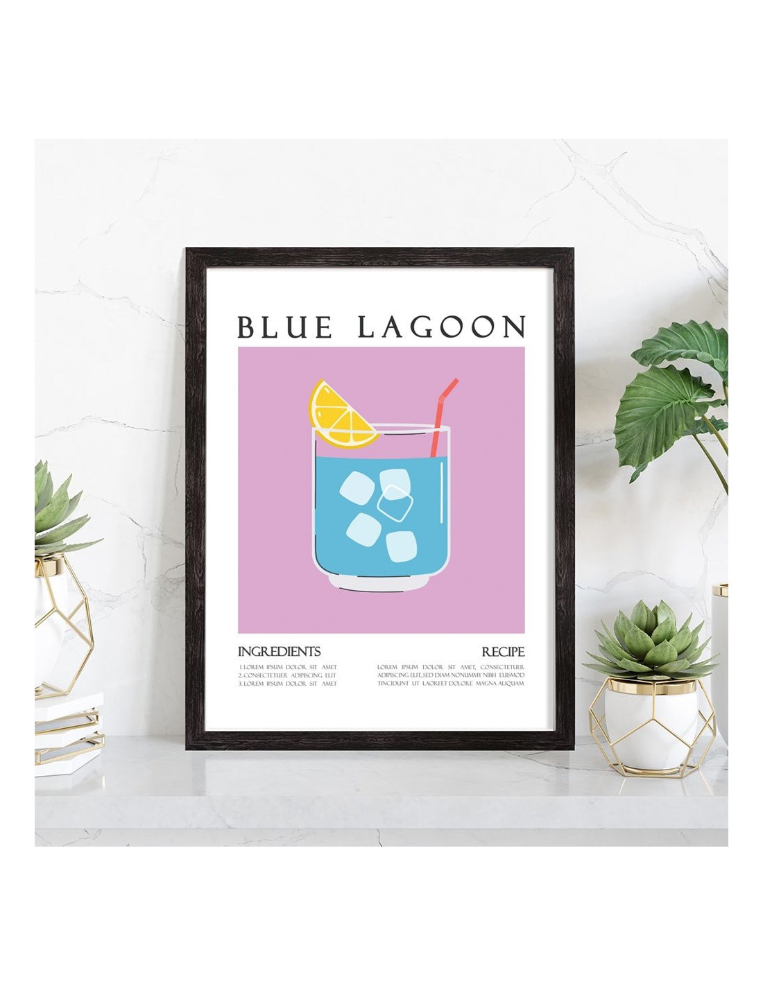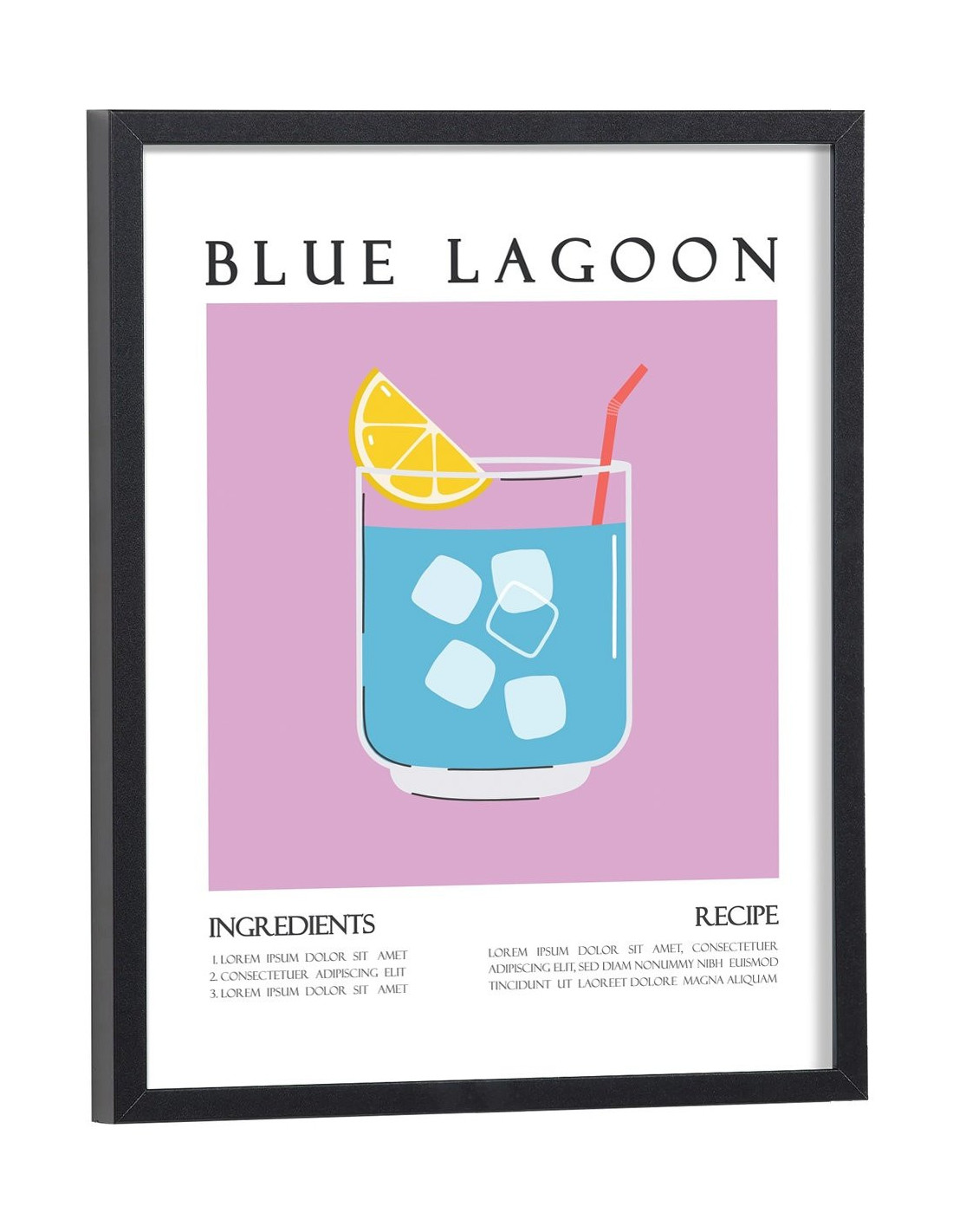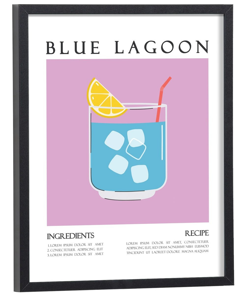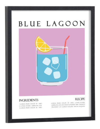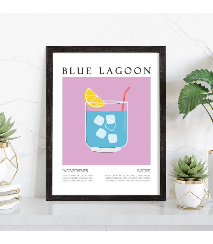Affiche décoration du célèbre cocktail Blue Lagoon. Découvrez cette belle affiche vintage colorée qui contient une image du verre avec le cocktail Blue Lagoon, les ingrédients utilisés ainsi que la recette de ce cocktail. L'affiche est vendue avec l'encadrement.