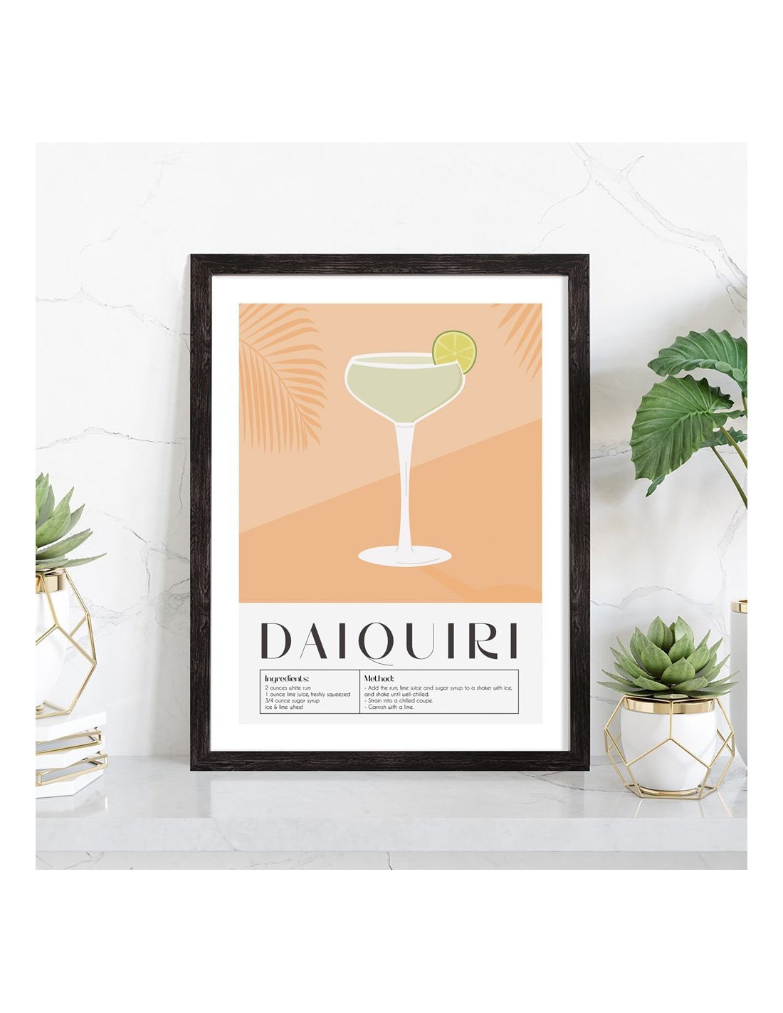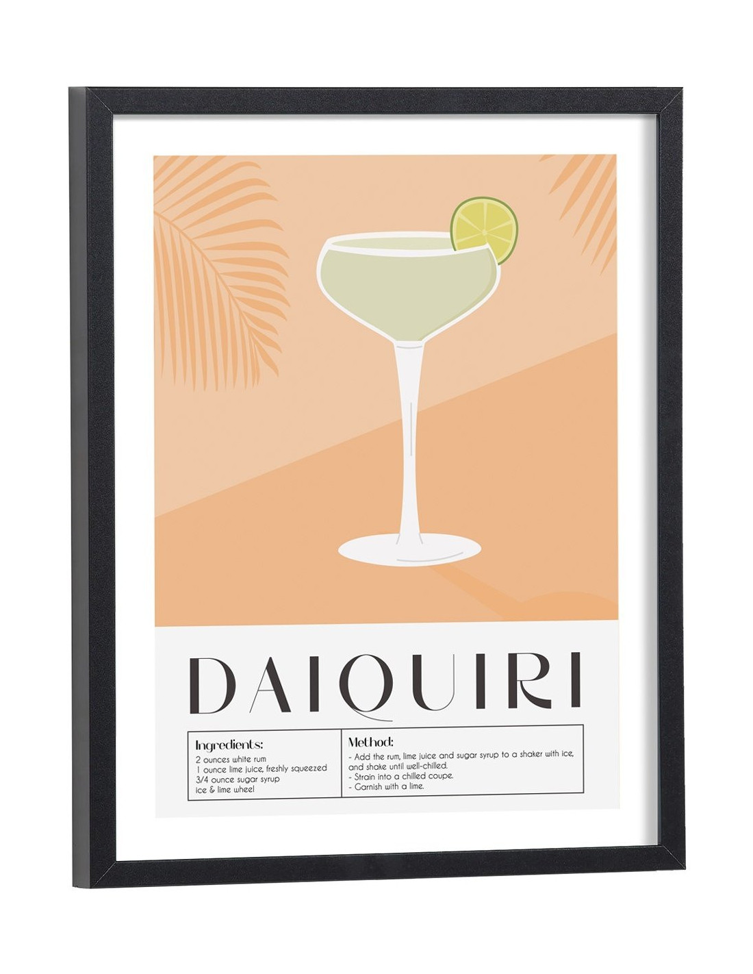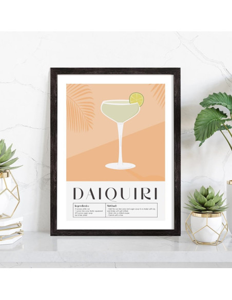 Affiche décoration du célèbre cocktail Daiquiri. Découvrez cette belle affiche vintage colorée qui contient une image du verre avec le cocktail Daiquiri, les ingrédients utilisés ainsi que la recette de ce cocktail. L'affiche est vendue avec l'encadrement.