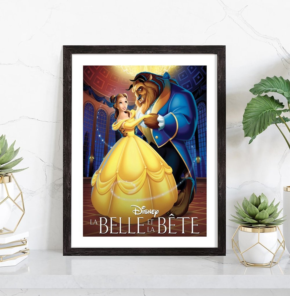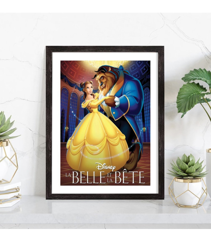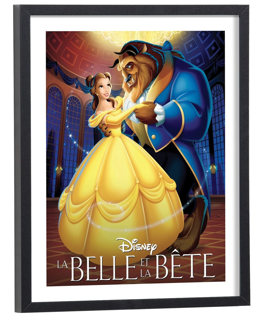 Affiche du film "La belle et la bête" des studios Disney. Affiche encadrée avec cadre en bois noir.