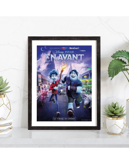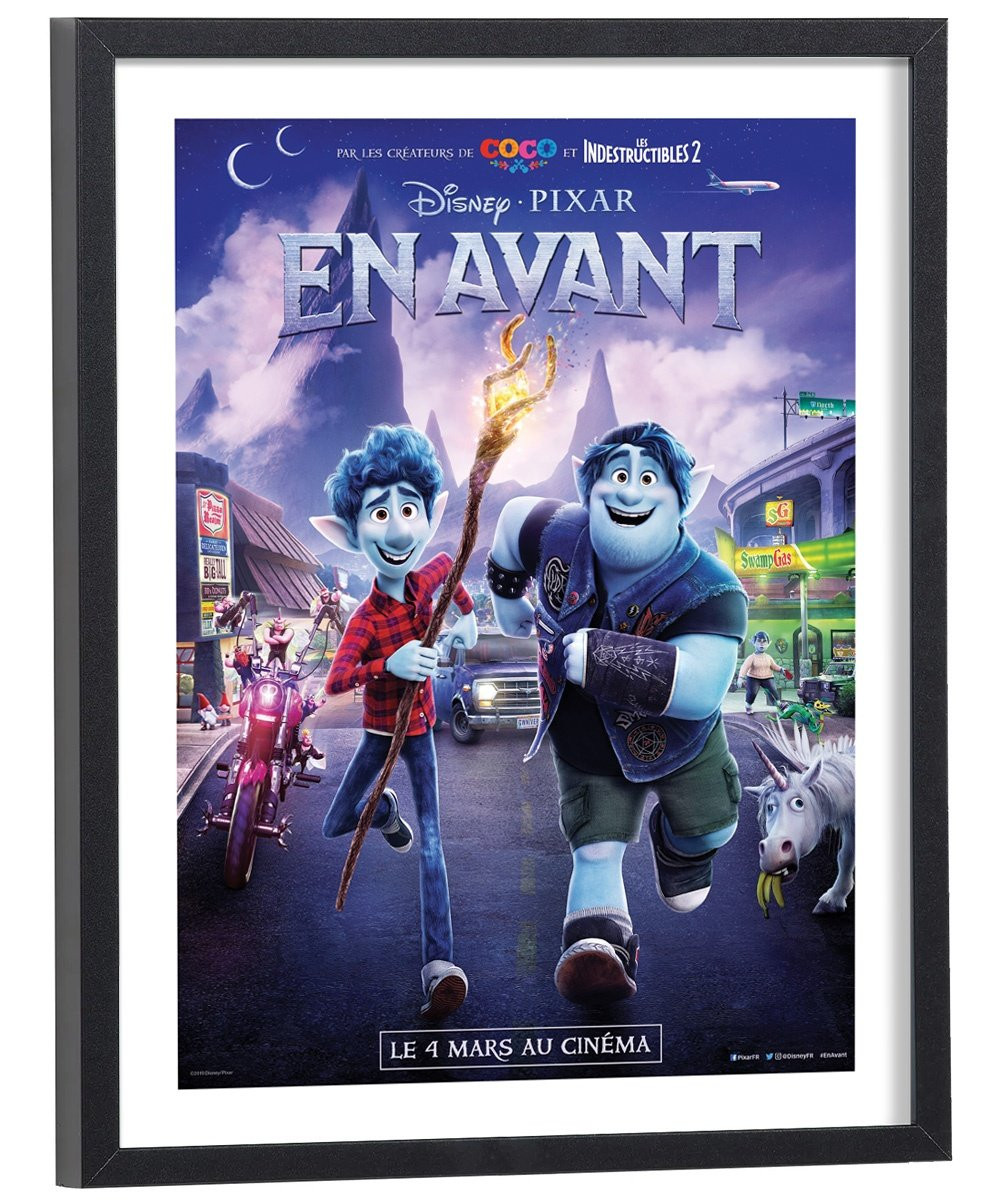 Affiche du film "En avant" des studios Disney Pixar. Affiche encadrée avec cadre en bois noir.