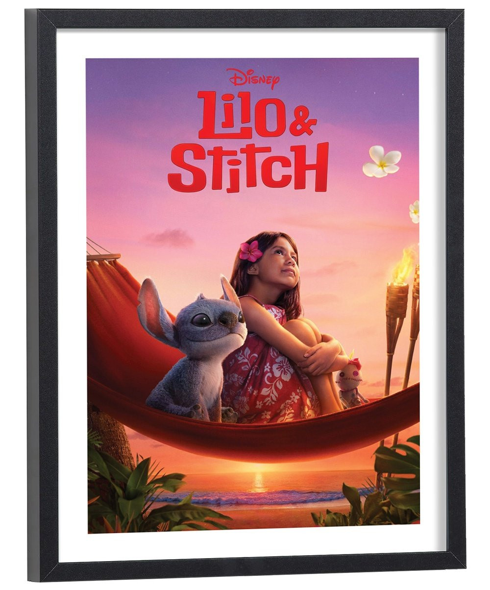 Affiche du film "Lilo et Stitch" des studios Disney Pixar. Affiche encadrée avec cadre en bois noir.