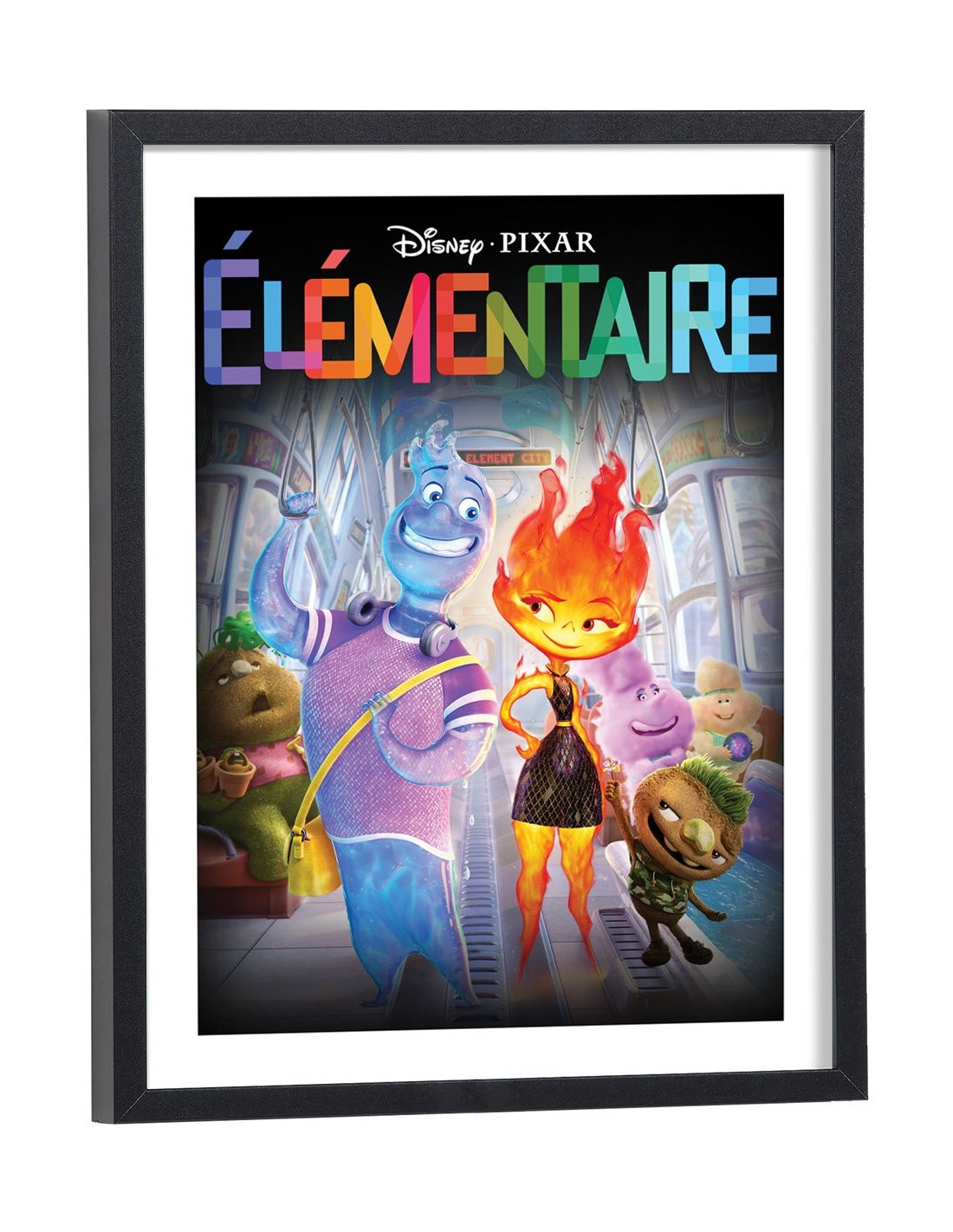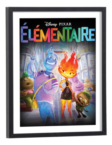 Affiche du film "Elementaire" des studios Disney Pixar. Affiche encadrée avec cadre en bois noir.