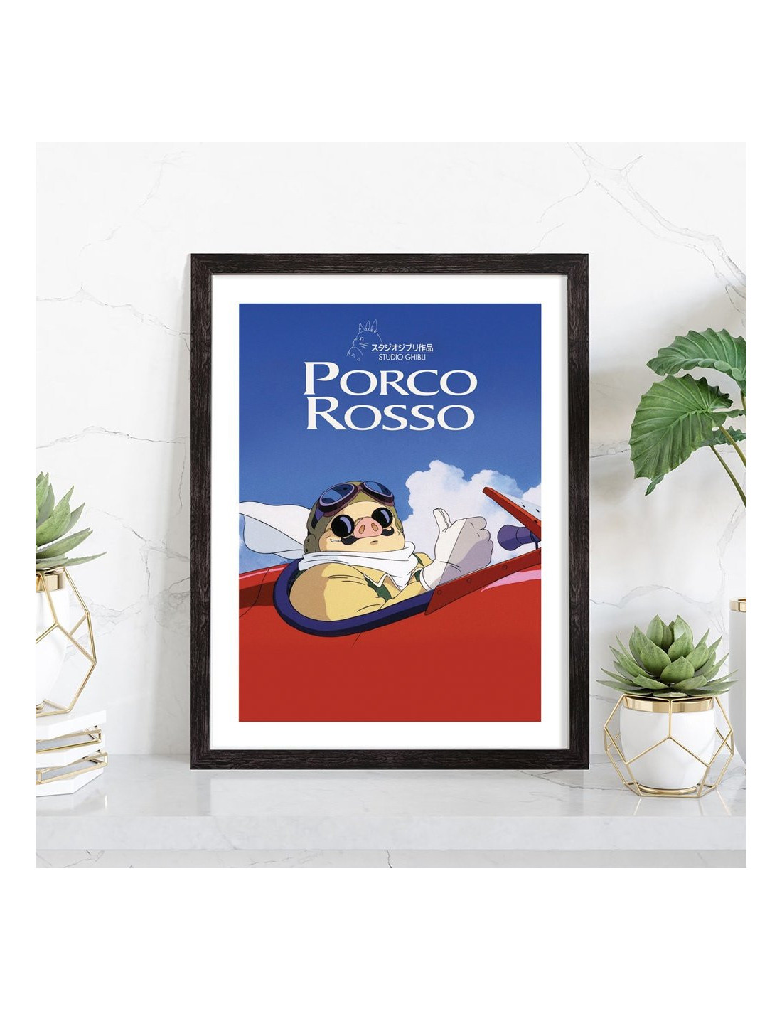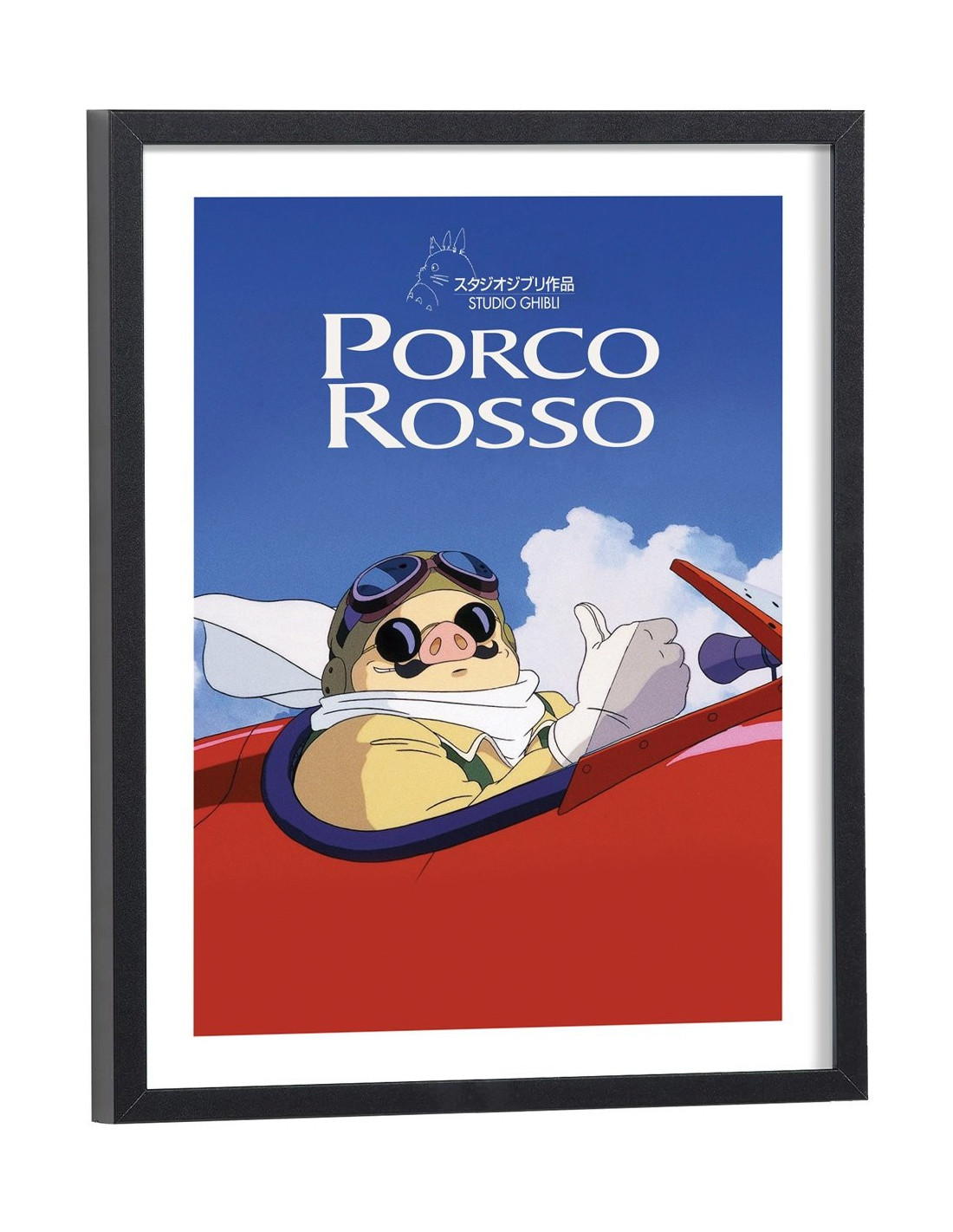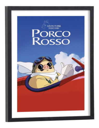 Affiche du film d'animation japonais "Porco Rosso" réalisé en 1992 par Hayao Miyazaki au sein du studio Ghibli. Affiche encadrée avec cadre en bois noir.