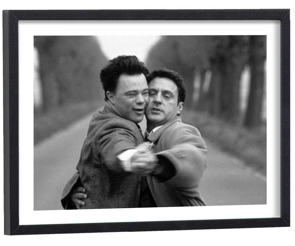 L'affiche présente une scène touchante en noir et blanc capturant un moment d'intense complicité entre Pascal Duquenne et Daniel Auteuil. L'étreinte chaleureuse des deux protagonistes, photographiée dans un flou artistique délicat, dégage une émotion palpable et une humanité profonde. Les tons monochromes renforcent l'authenticité de cet instant suspendu, symbole universel de l'amitié et de la différence.