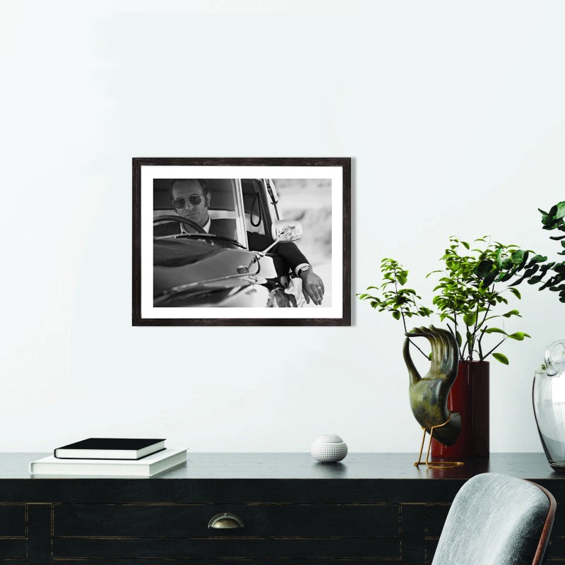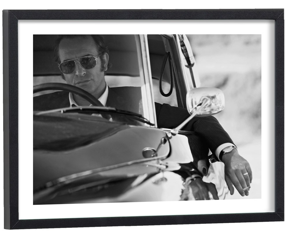 Plongez dans l'univers du film culte La French avec Jean Dujardin au volant de sa voiture emblématique. Affiche cinéma en noir et blanc format 40x30cm, encadrée dans un cadre bois noir élégant, parfaite pour créer une ambiance rétro dans votre salon ou bureau.