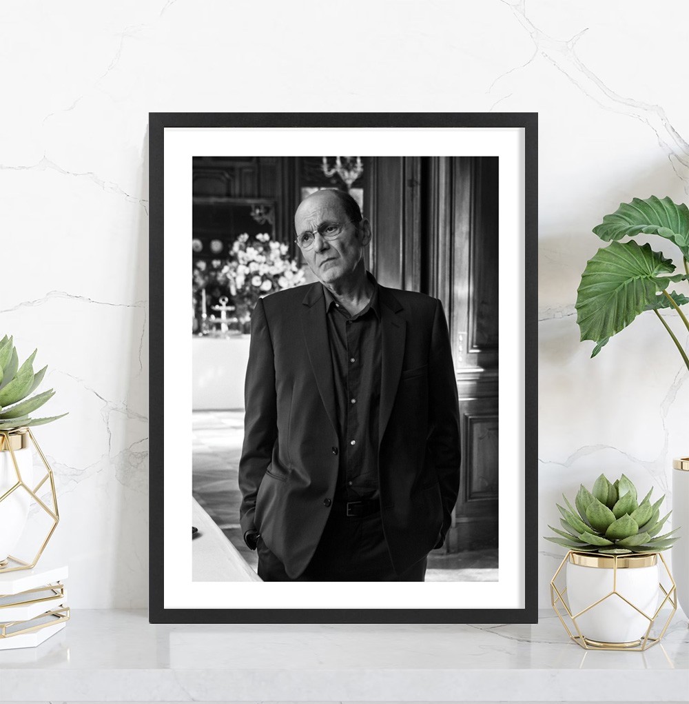 Portrait saisissant de Jean-Pierre Bacri capturé dans toute sa prestance, vêtu d'un costume sombre élégant et de lunettes caractéristiques. L'acteur pose avec son regard perçant et son expression légèrement mélancolique si reconnaissable, dans un décor raffiné aux boiseries classiques. Le noir et blanc confère une dimension intemporelle à l'image, soulignant le charisme et la profondeur de l'interprète.